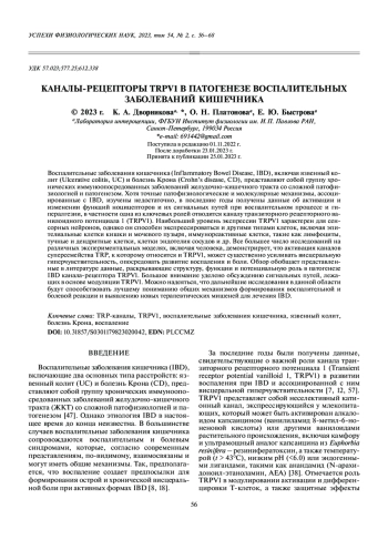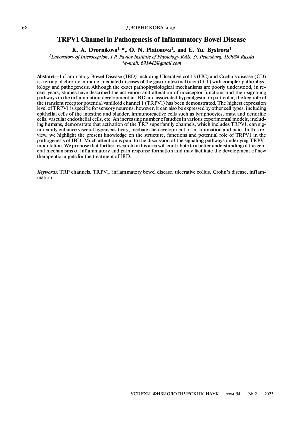 Воспалительные заболевания кишечника (Inflammatory Bowel Disease, IBD), включая язвенный колит (Ulcerative colitis, UC) и болезнь Крона (Crohn’s disease, CD), представляют собой группу хронических иммуноопосредованных заболеваний желудочно-кишечного тракта со сложной патофизиологией и патогенезом. Хотя точные патофизиологические и молекулярные механизмы, ассоциированные с IBD, изучены недостаточно, в последние годы получены данные об активации и изменении функций ноцицепторов и их сигнальных путей при воспалительном процессе и гипералгезии, в частности одна из ключевых ролей отводится каналу транзиторного рецепторного ванилоидного потенциала 1 (TRPV1). Наибольший уровень экспрессии TRPV1 характерен для сенсорных нейронов, однако он способен экспрессироваться и другими типами клеток, включая эпителиальные клетки кишки и мочевого пузыря, иммунореактивные клетки, такие как лимфоциты, тучные и дендритные клетки, клетки эндотелия сосудов и др. Все большее число исследований на различных экспериментальных моделях, включая человека, демонстрирует, что активация каналов суперсемейства TRP, к которому относится и TRPV1, может существенно усиливать висцеральную гиперчувствительность, опосредовать развитие воспаления и боли. Обзор обобщает представленные в литературе данные, раскрывающие структуру, функции и потенциальную роль в патогенезе IBD канала-рецептора TRPV1. Большое внимание уделено обсуждению сигнальных путей, лежащих в основе модуляции TRPV1. Можно надеяться, что дальнейшие исследования в данной области будут способствовать лучшему пониманию общих механизмов формирования воспалительной и болевой реакции и выявлению новых терапевтических мишеней для лечения IBD.