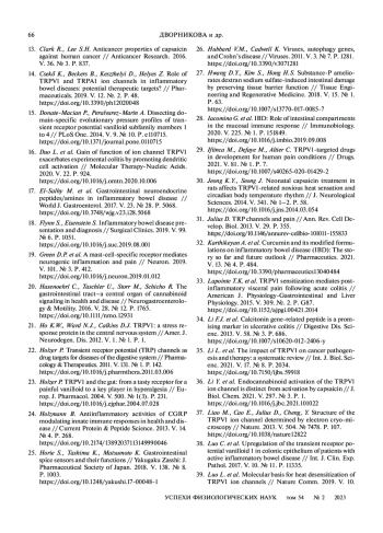 64. Zielińska M. et al. Role of transient receptor potential channels in intestinal inflammation and visceral pain: novel targets in inflammatory bowel diseases // Inflammatory Bowel Diseases. 2015. V. 21. № 2. P. 419. DOI: 10.1097/MIB.0000000000000234