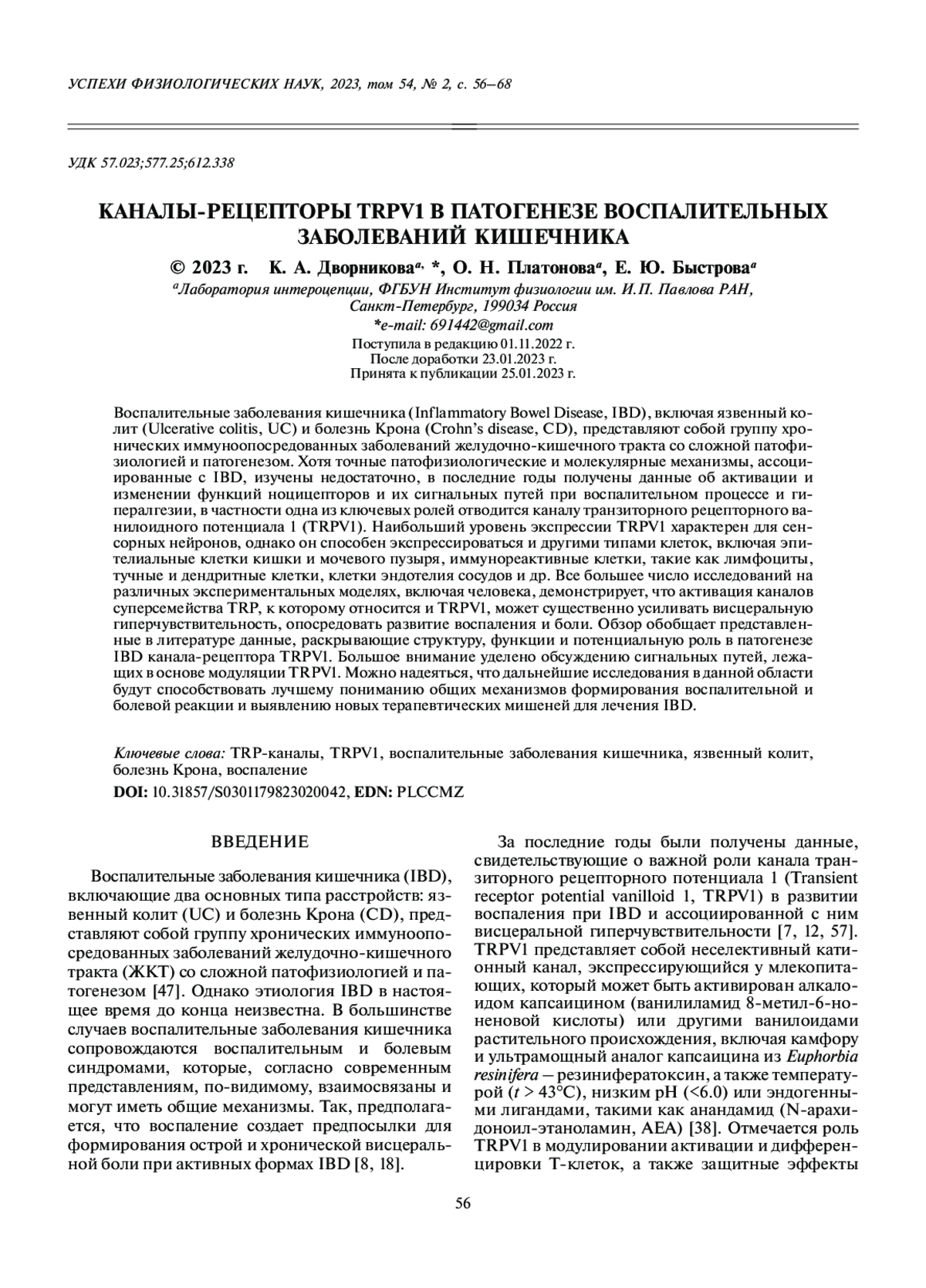 56. Wu Y. et al. TLR4 mediates upregulation and sensitization of TRPV1 in primary afferent neurons in 2, 4, 6-trinitrobenzene sulfate-induced colitis // Molecular Pain. 2019. V. 15. P. 1744806919830018. DOI: 10.1177/1744806919830018