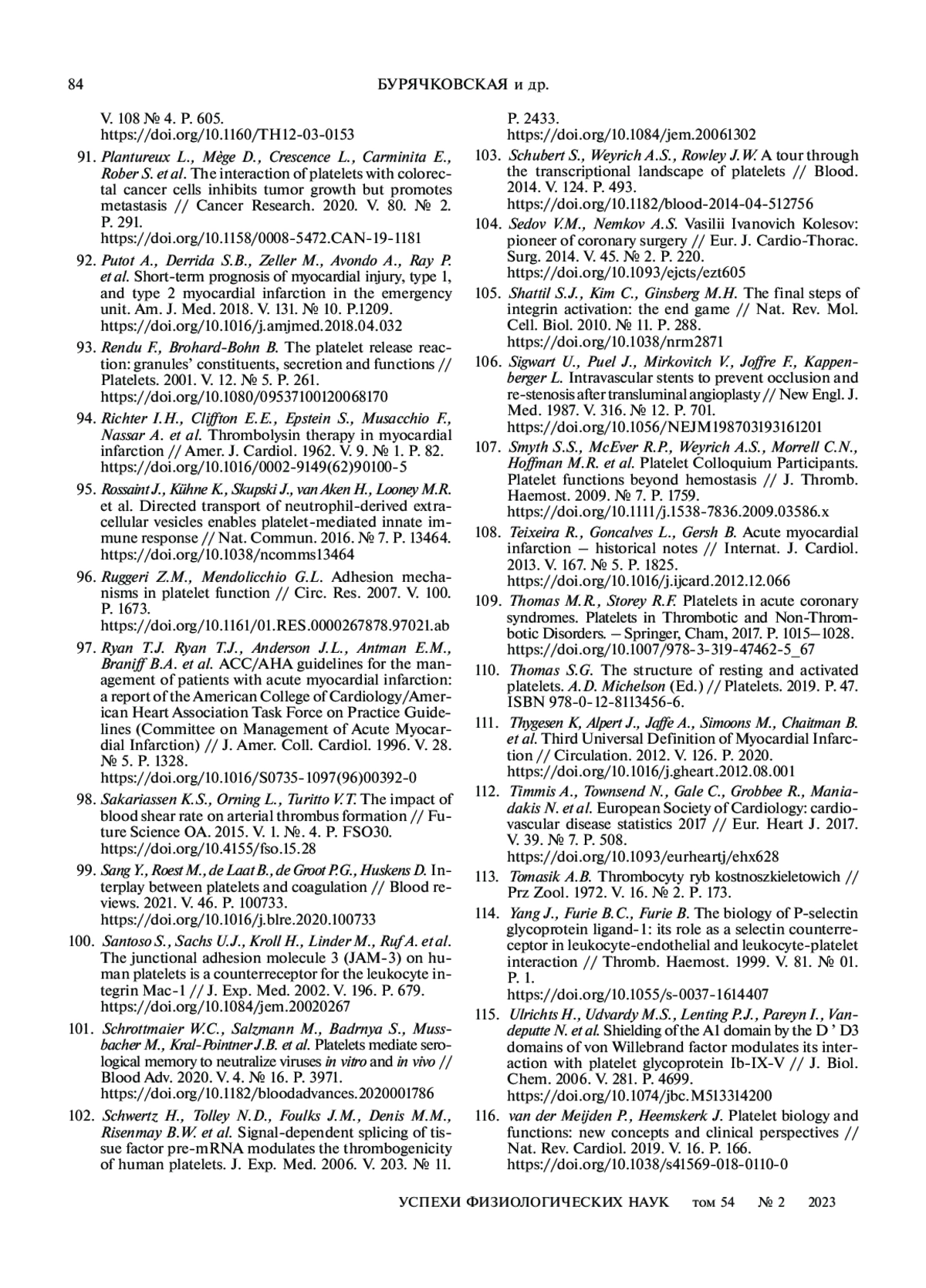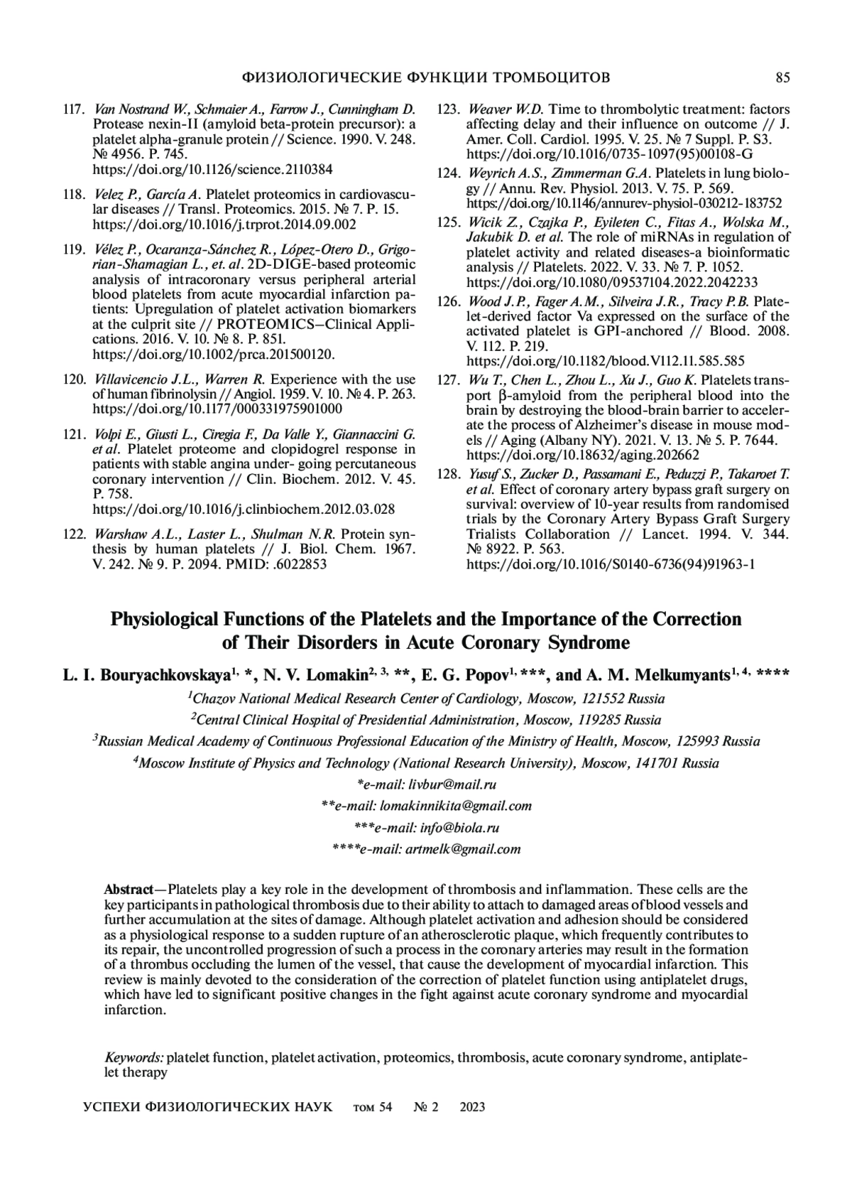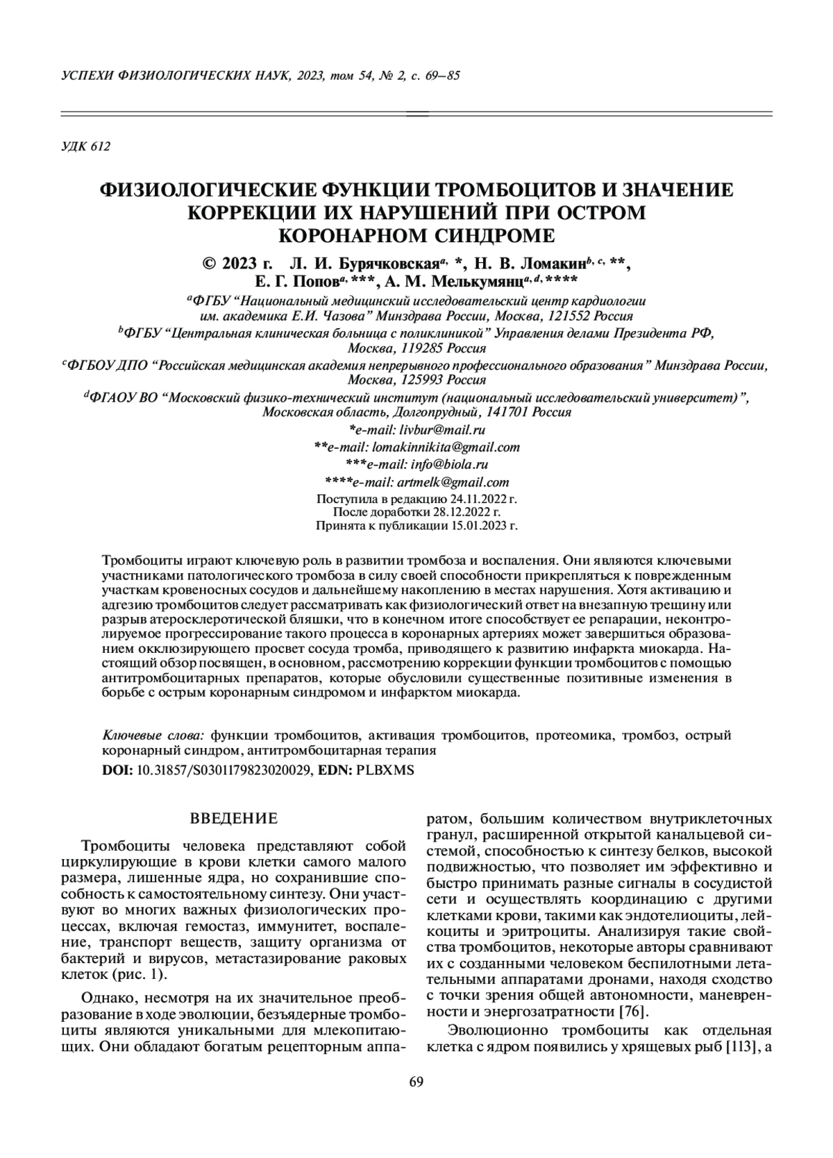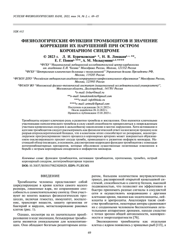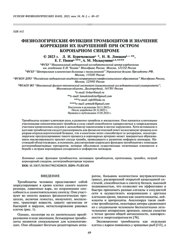 БУРЯЧКОВСКАЯ Л. И., ЛОМАКИН Н. В., ПОПОВ Е. Г., МЕЛЬКУМЯНЦ А. М. ФИЗИОЛОГИЧЕСКИЕ ФУНКЦИИ ТРОМБОЦИТОВ И ЗНАЧЕНИЕ КОРРЕКЦИИ ИХ НАРУШЕНИЙ ПРИ ОСТРОМ КОРОНАРНОМ СИНДРОМЕ // УСПЕХИ ФИЗИОЛОГИЧЕСКИХ НАУК. 2023. Т. 54 № 2 (6 СТ.)