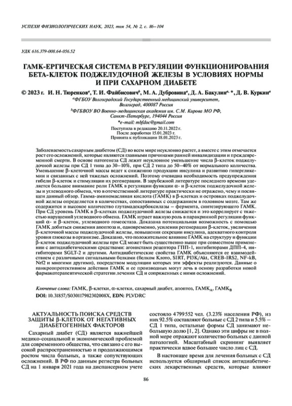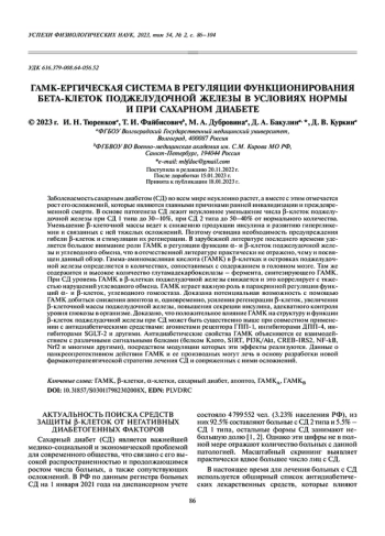 Статья: ГАМК-ЕРГИЧЕСКАЯ СИСТЕМА В РЕГУЛЯЦИИ ФУНКЦИОНИРОВАНИЯ БЕТА-КЛЕТОК ПОДЖЕЛУДОЧНОЙ ЖЕЛЕЗЫ В УСЛОВИЯХ НОРМЫ И ПРИ САХАРНОМ ДИАБЕТЕ (2023)
