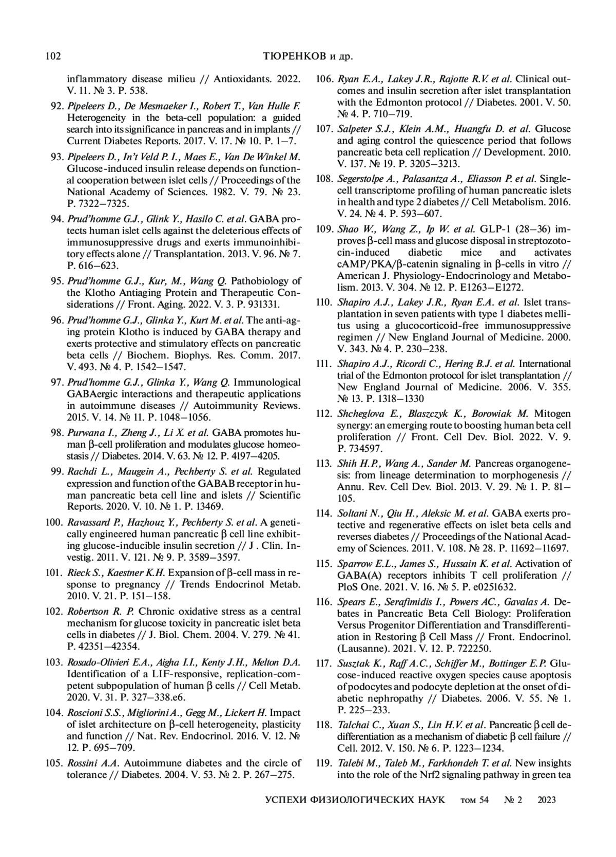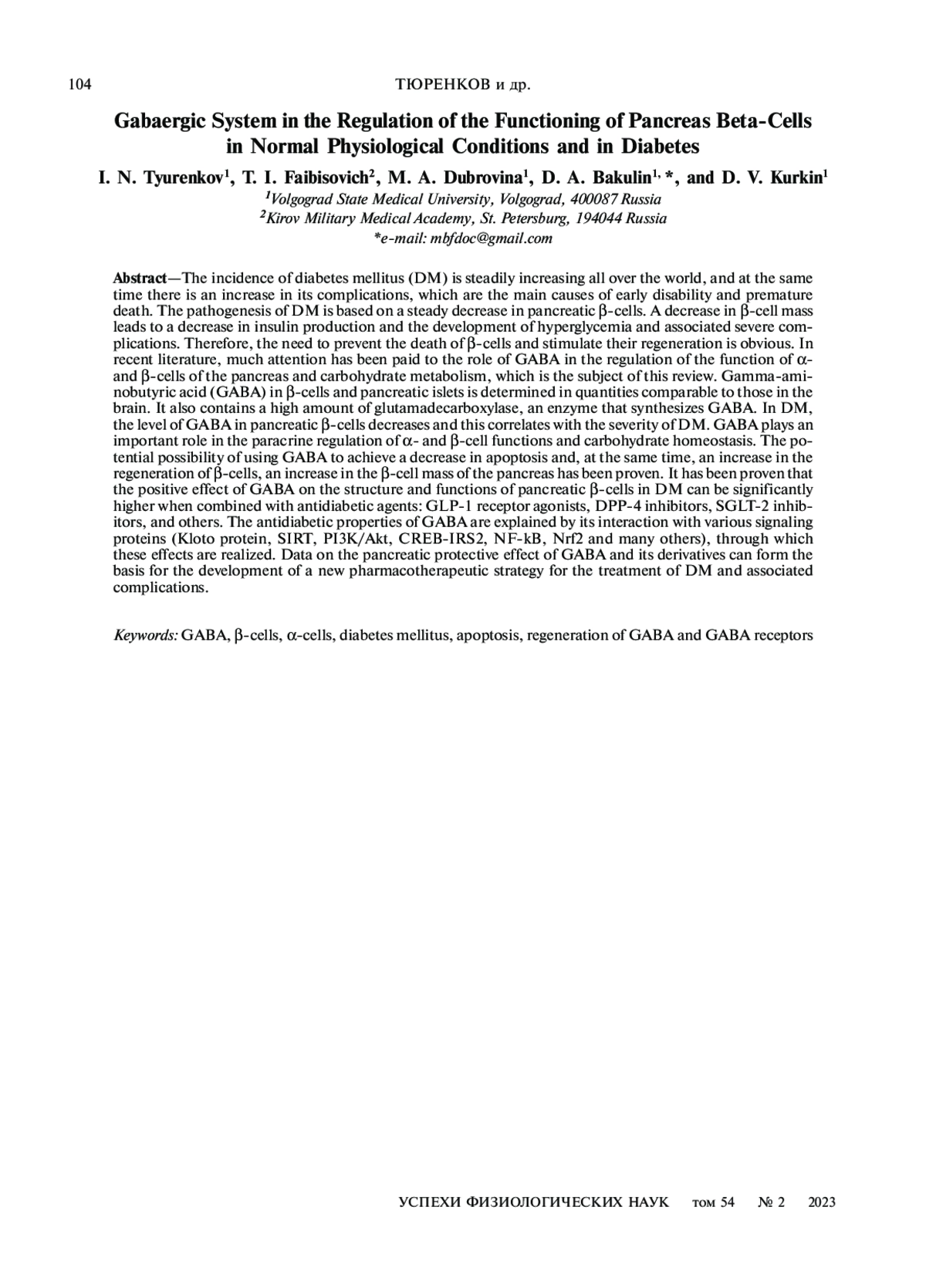 ТЮРЕНКОВ И. Н., ФАЙБИСОВИЧ Т.И., ДУБРОВИНА М. А., БАКУЛИН Д. А., КУРКИН Д. В. ГАМК-ЕРГИЧЕСКАЯ СИСТЕМА В РЕГУЛЯЦИИ ФУНКЦИОНИРОВАНИЯ БЕТА-КЛЕТОК ПОДЖЕЛУДОЧНОЙ ЖЕЛЕЗЫ В УСЛОВИЯХ НОРМЫ И ПРИ САХАРНОМ ДИАБЕТЕ // УСПЕХИ ФИЗИОЛОГИЧЕСКИХ НАУК. 2023. Т. 54 № 2 (6 СТ.)