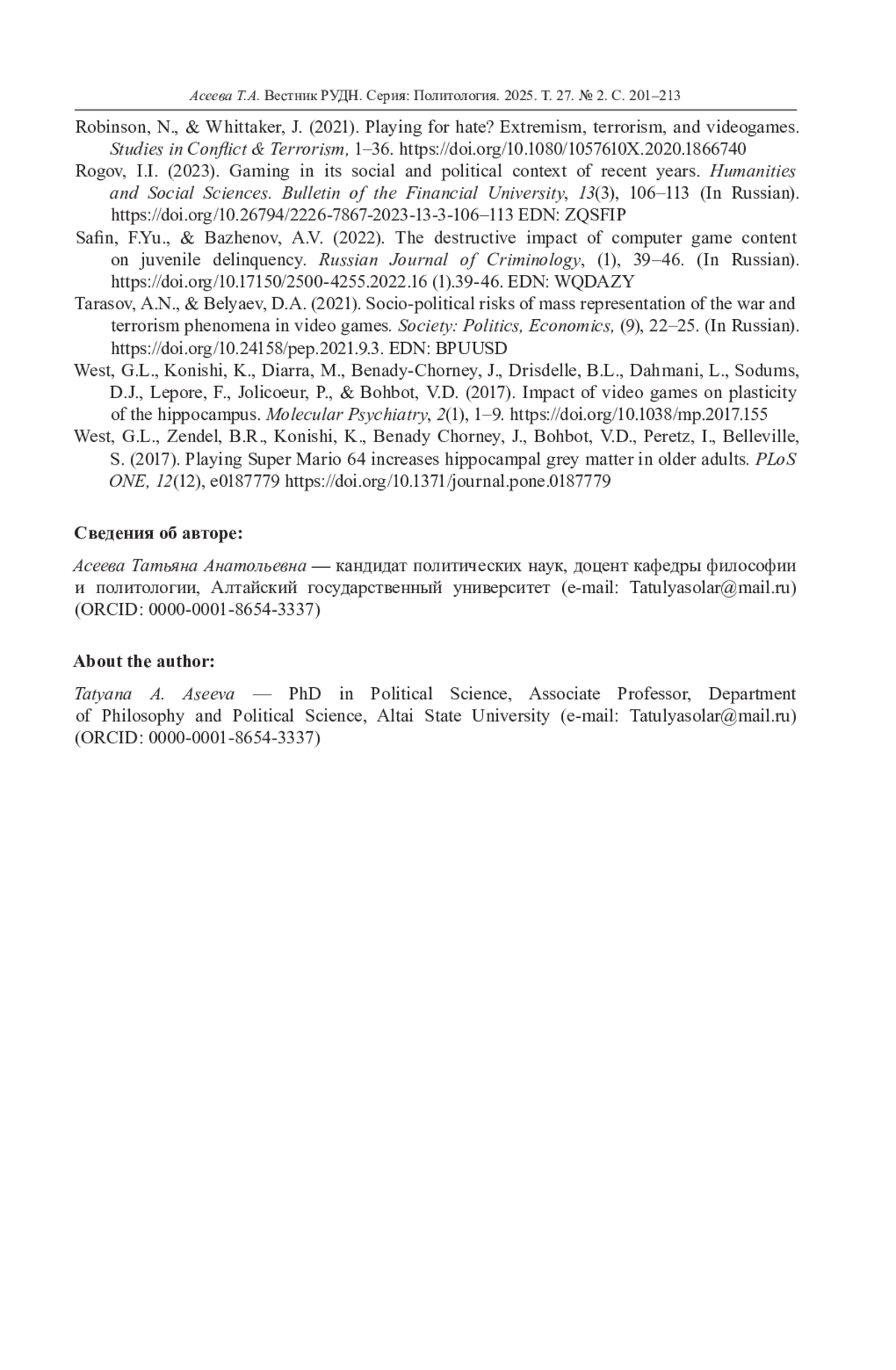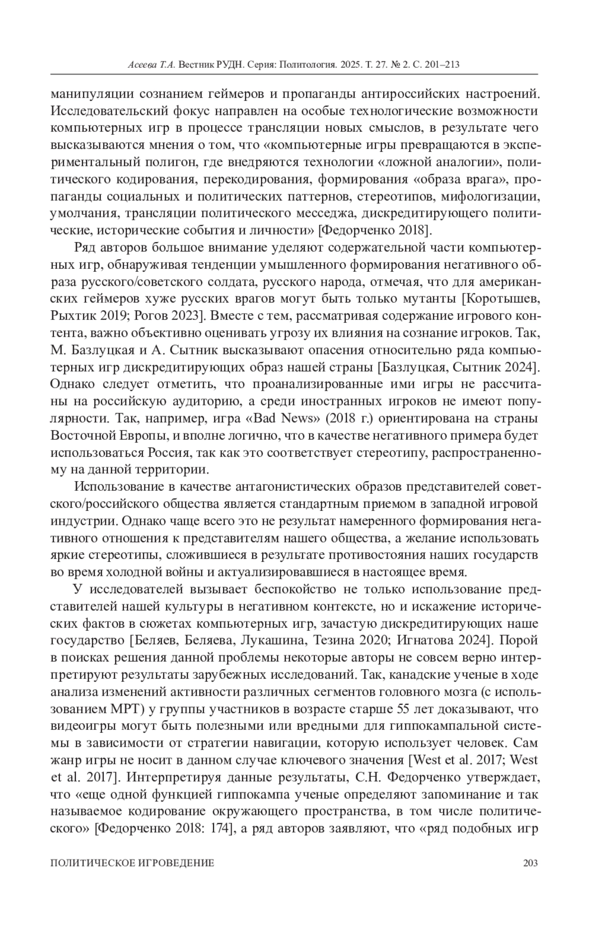11. Федорченко С.Н. Computer game studies: новые горизонты для политической науки и практики // Вестник Омского университета. Серия “Исторические науки”. 2018. № 4 (20). С. 172-182. DOI: 10.25513/2312-1300.2018.4.172-182 EDN: YVMZHV