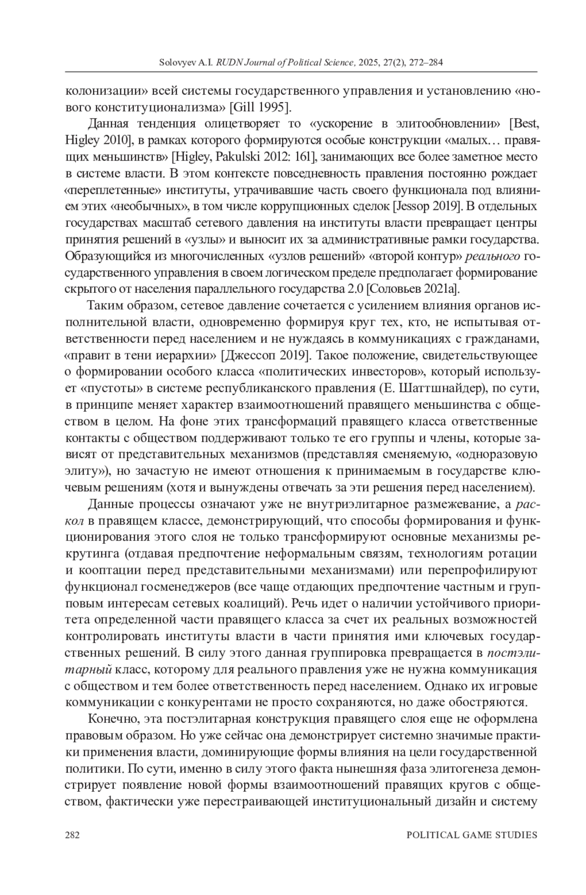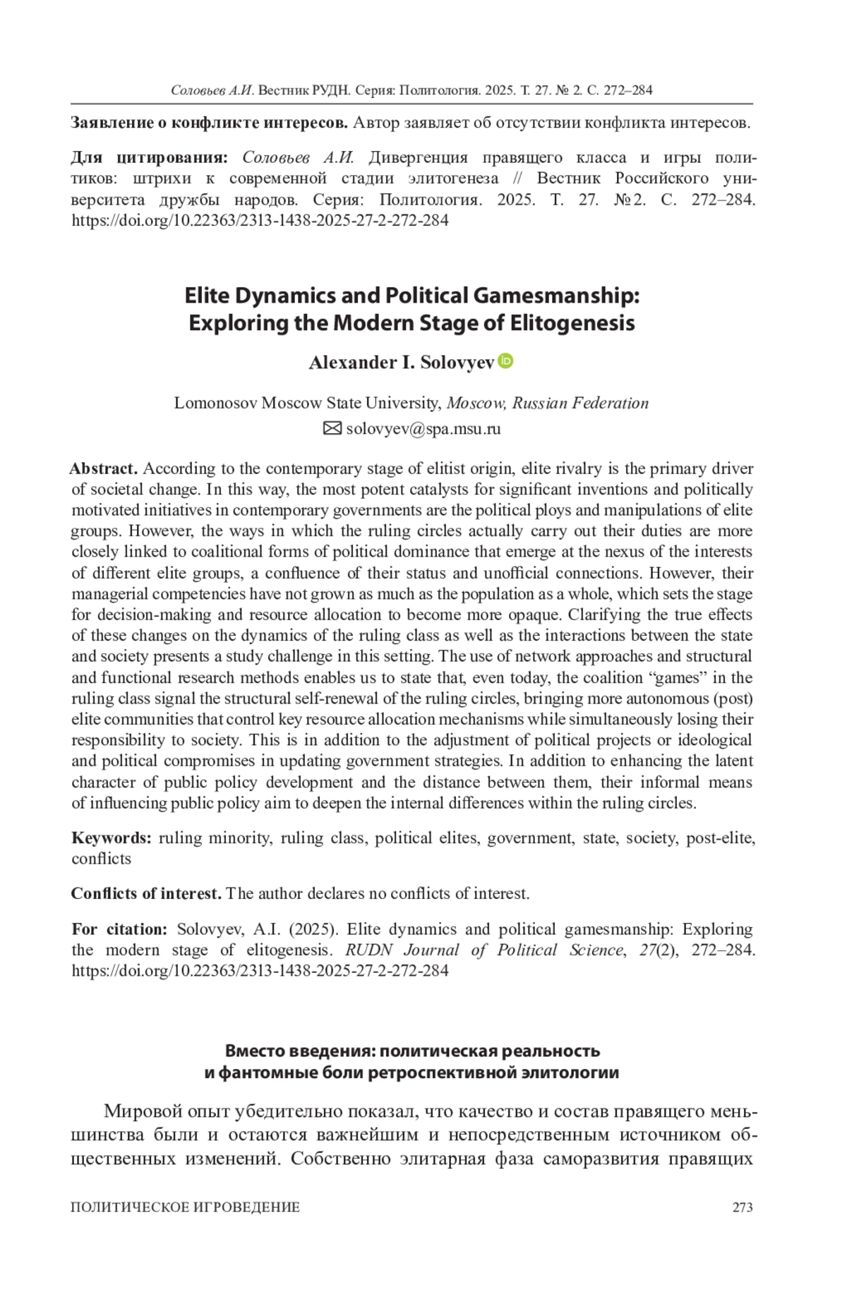 10. Соловьёв А.И. Механизмы политического господства или Как правит выигрышная коалиция // Полис. Политические исследования. 2024. № 2. С. 96-117. DOI: 10.17976/jpps/2024.02.08 EDN: CGFBMG