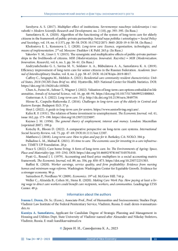 13. Andryushchenko G. I., Savina M. V., Soldatov A. A., Bikbulatova A. A., Samofatova K. A. (2019). Efficiency improvement of long-term care for senior citizens in the Russian Federation. Academic Journal of Interdisciplinary Studies, vol. 8, no. 2, pp. 58-67. DOI: 10.2478/ajis-2019-0017 EDN: IOIIWM