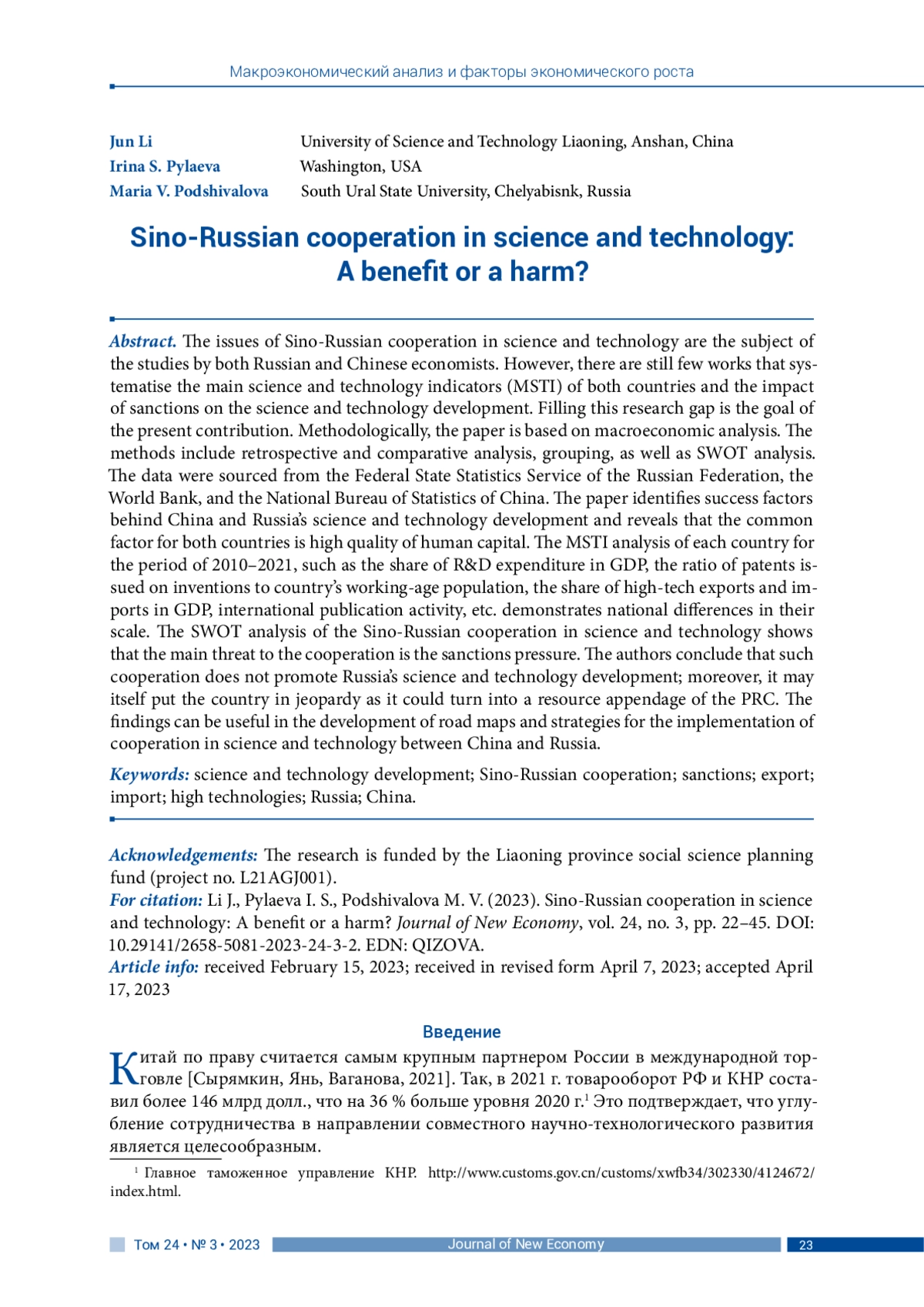 23. Фэн Ц. (2021). Научно-техническое сотрудничество России и Китая как фактор технологического развития России // Управление риском. № 4 (100). С. 46-57. EDN: ZMOMMT