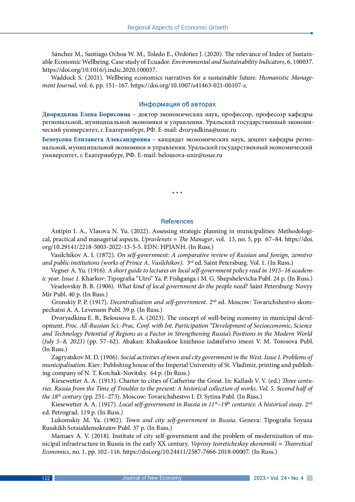 19. Belousova E. A. (2022). Economic well-being: Semantic environment and research contexts at a municipal level. Journal of New Economy, vol. 23, no. 4, pp. 46-68. DOI: 10.29141/2658-5081-2022-23-4-3 EDN: JTTVZH
