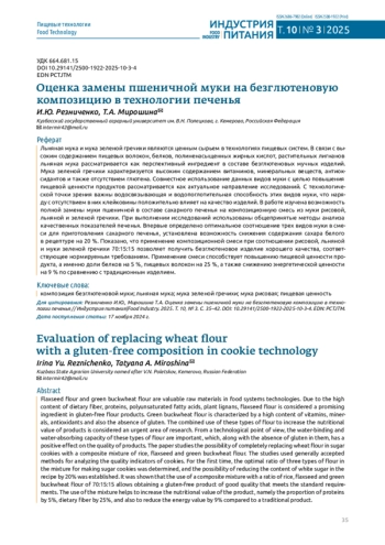 Льняная мука и мука зеленой гречихи являются ценным сырьем в технологиях пищевых систем. В связи с высоким содержанием пищевых волокон, белков, полиненасыщенных жирных кислот, растительных лигнанов льняная мука рассматривается как перспективный ингредиент в составе безглютеновых мучных изделий. Мука зеленой гречихи характеризуется высоким содержанием витаминов, минеральных веществ, антиоксидантов и также отсутствием глютена. Совместное использование данных видов муки с целью повышения пищевой ценности продуктов рассматривается как актуальное направление исследований. С технологической точки зрения важны водосвязывающая и водопоглотительная способность этих видов муки, что наряду с отсутствием в них клейковины положительно влияет на качество изделий. В работе изучена возможность полной замены муки пшеничной в составе сахарного печенья на композиционную смесь из муки рисовой, льняной и зеленой гречихи. При выполнении исследований использованы общепринятые методы анализа качественных показателей печенья. Впервые определено оптимальное соотношение трех видов муки в смеси для приготовления сахарного печенья, установлена возможность снижения содержания сахара белого в рецептуре на 20 %. Показано, что применение композиционной смеси при соотношении рисовой, льняной и муки зеленой гречихи 70:15:15 позволяет получить безглютеновое изделие хорошего качества, соответствующее нормируемым требованиям. Применение смеси способствует повышению пищевой ценности продукта, а именно доли белков на 5 %, пищевых волокон на 25 %, а также снижению энергетической ценности на 9 % по сравнению с традиционным изделием