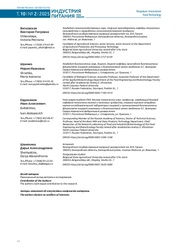 Улучшение качественных характеристик зернового хлеба, обусловленное его высокой востребованностью у потребителей и потенциальной пользой для здоровья человека, определяет актуальность научных исследований в области хлебопечения. Целью данного исследования является разработка и внедрение инновационных технологических подходов, основанных на применении заквасок молочнокислых бактерий, для расширения ассортимента и повышения качества зернового хлеба из полбы. Отмечаются значительные улучшения органолептических показателей качества зернового хлеба из полбы, выработанного с применением заквасочных культур. Применение заквасок при производстве зернового хлеба из полбы позволяет увеличить удельный объем хлеба на 19 %. Опытные образцы характеризовались повышенной пористостью (49,7–51,6 %) по сравнению с контролем (45,6 %). Реологические исследования показали увеличение общей деформации на 62 %, пластической деформации – в 2 раза, упругой деформации – на 37 %, что свидетельствует о более мягкой, пластичной и эластичной текстуре. Первые признаки плесневения у образцов зернового хлеба из полбы, выработанного с применением заквасок молочнокислых бактерий, отмечены через 120 ч хранения, что значительно превышает значения контрольных образцов (72 часа). Установлено, что зерновой хлеб из полбы на заквасках характеризуется высоким содержанием пищевых волокон (7,58 г/100 г) и низким гликемическим индексом (47,1 %). Установлено, что наиболее перспективной закваской для применения в технологии зернового хлеба из полбы является закваска 4, которая содержит в своем составе штаммы L. fermentum 10, L. casei 32, L. plantarum 24 в соотношении 1:1:2.