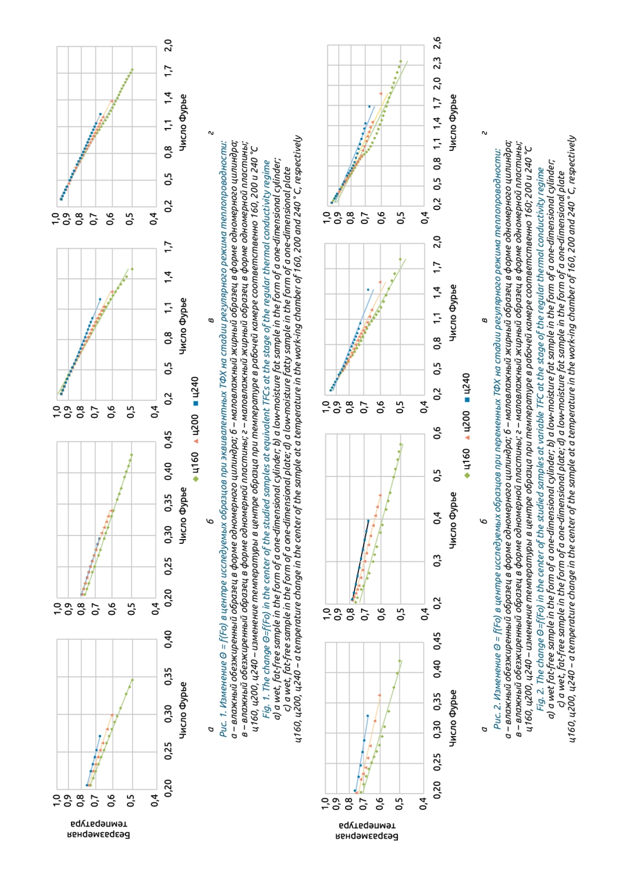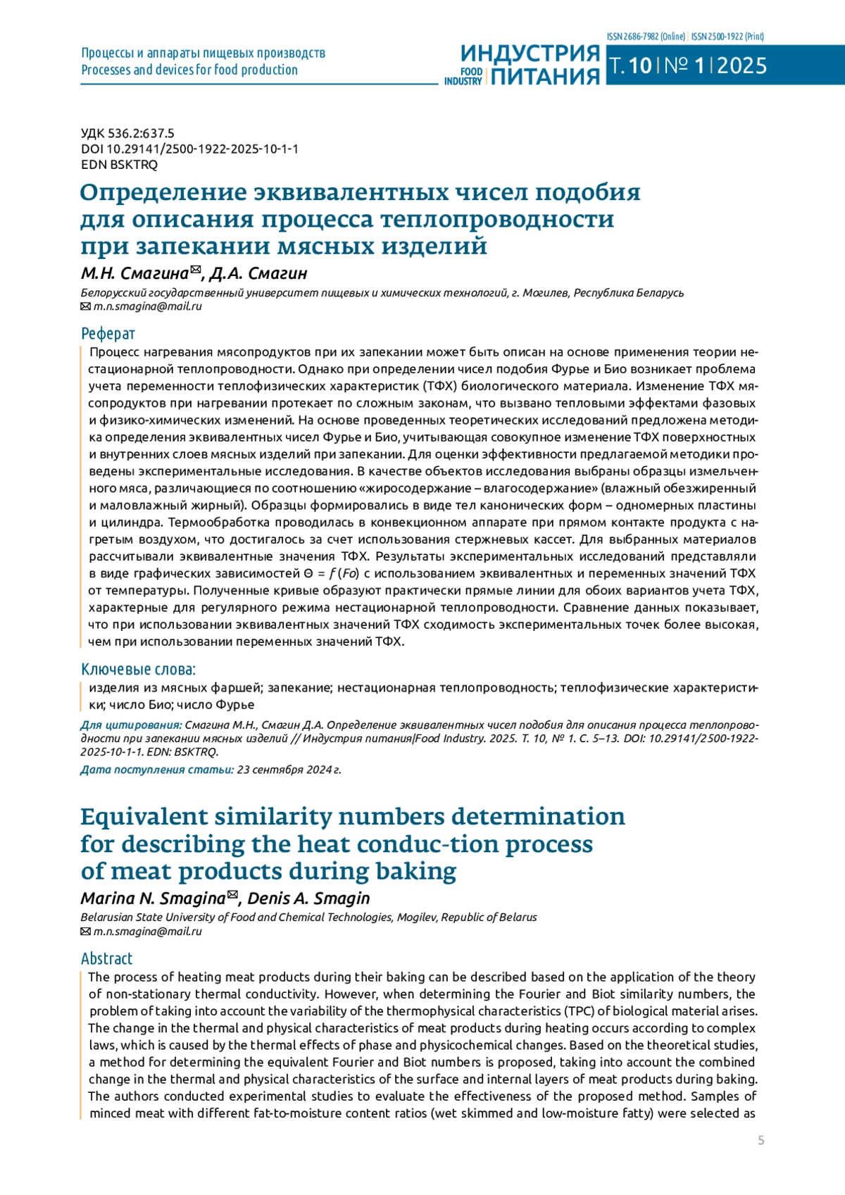 Процесс нагревания мясопродуктов при их запекании может быть описан на основе применения теории нестационарной теплопроводности. Однако при определении чисел подобия Фурье и Био возникает проблема учета переменности теплофизических характеристик (ТФХ) биологического материала. Изменение ТФХ мясопродуктов при нагревании протекает по сложным законам, что вызвано тепловыми эффектами фазовых и физико-химических изменений. На основе проведенных теоретических исследований предложена методика определения эквивалентных чисел Фурье и Био, учитывающая совокупное изменение ТФХ поверхностных и внутренних слоев мясных изделий при запекании. Для оценки эффективности предлагаемой методики проведены экспериментальные исследования. В качестве объектов исследования выбраны образцы измельченного мяса, различающиеся по соотношению «жиросодержание – влагосодержание» (влажный обезжиренный и маловлажный жирный). Образцы формировались в виде тел канонических форм – одномерных пластины и цилиндра. Термообработка проводилась в конвекционном аппарате при прямом контакте продукта с нагретым воздухом, что достигалось за счет использования стержневых кассет. Для выбранных материалов рассчитывали эквивалентные значения ТФХ. Результаты экспериментальных исследований представляли в виде графических зависимостей Θ = f (Fo) с использованием эквивалентных и переменных значений ТФХ от температуры. Полученные кривые образуют практически прямые линии для обоих вариантов учета ТФХ, характерные для регулярного режима нестационарной теплопроводности. Сравнение данных показывает, что при использовании эквивалентных значений ТФХ сходимость экспериментальных точек более высокая, чем при использовании переменных значений ТФХ