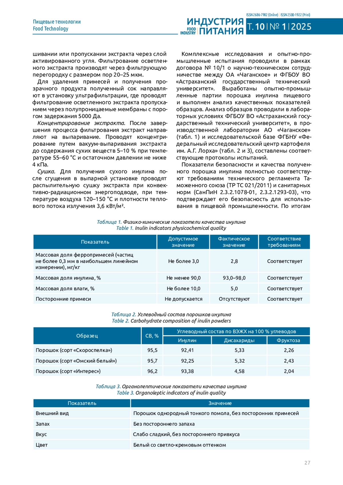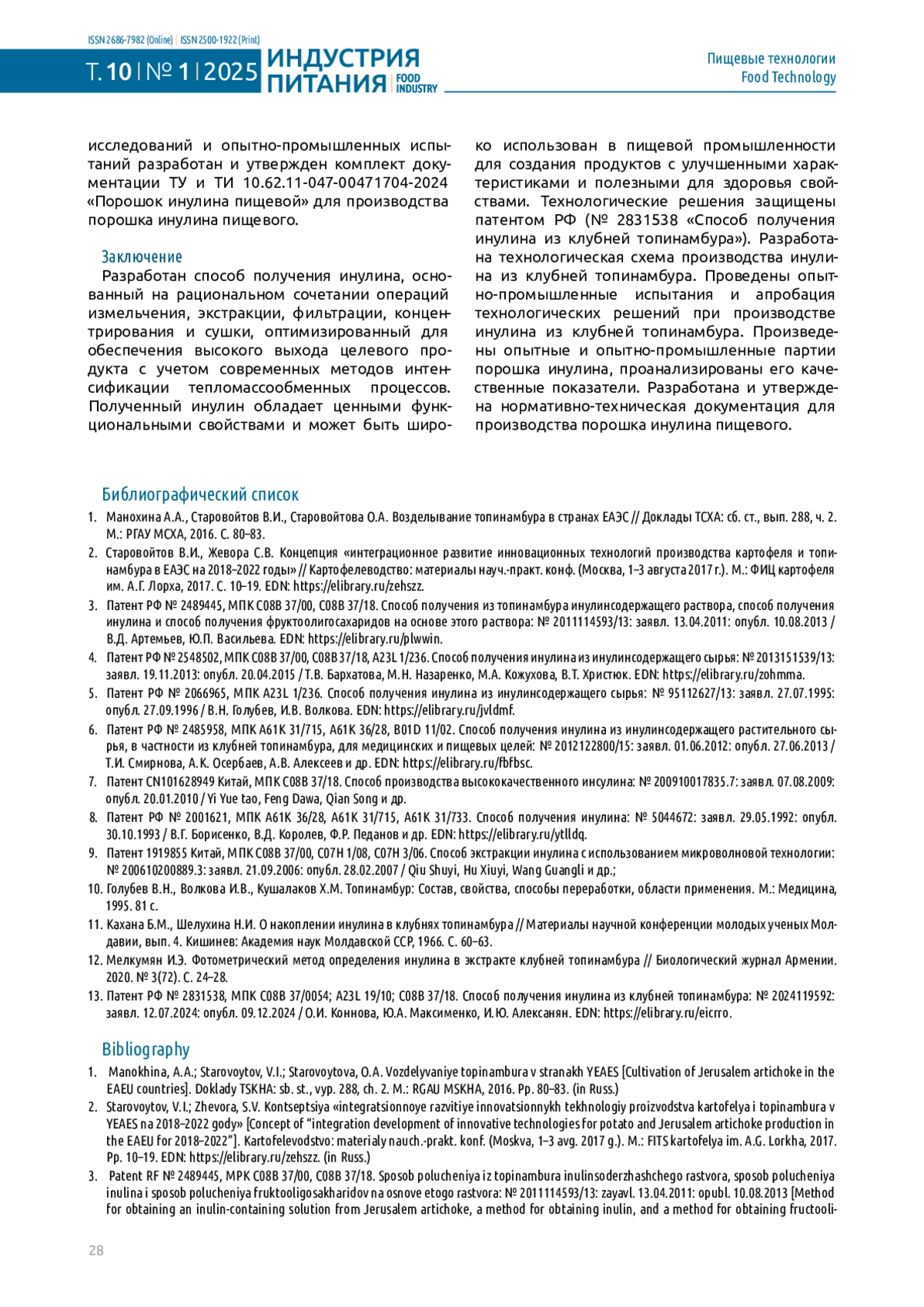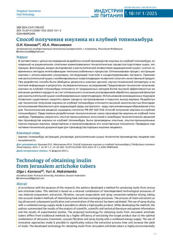 В соответствии с целью исследований разработан способ производства инулина из клубней топинамбура, основанный на рациональном сочетании взаимозависимых технологических процессов подготовки сырья, экстракции, фильтрации, вакуум-выпаривания и распылительной конвективно-радиационной сушки с учетом современных методов интенсификации тепломассообменных процессов. Оптимизирован процесс экстракции инулина с использованием ультразвука, последующей очисткой и концентрированием экстракта. Применение распылительной сушки с комбинированным энергоподводом позволило получить качественный продукт. При разработке способа были обобщены результаты анализа научной, научно-технической литературы и патентной информации и результаты экспериментальных исследований. Предлагаемая технология получения инулина из клубней топинамбура отличается от традиционных методов более высокой эффективностью извлечения целевого продукта за счет оптимального сочетания ультразвуковой обработки, вакуумной фильтрации и распылительной сушки с комбинированным энергоподводом. Использование инновационных подходов позволило существенно сократить время процесса экстрагирования и повысить выход инулина. Разработанная технология получения инулина из клубней топинамбура отличается высокой экологичностью благодаря использованию безопасного для окружающей среды экстрагента – воды при минимизации образования отходов. Технологические решения защищены патентом РФ (No 2831538 «Способ получения инулина из клубней топинамбура»). Представлена разработанная технологическая схема производства инулина из клубней топинамбура. Приведены результаты опытно-промышленных испытаний и апробации технологических решений при производстве инулина из клубней топинамбура. Были произведены опытные, опытно-промышленные партии порошка инулина, представлены и проанализированы его качественные показатели. Приведена нормативно-техническая документация для производства порошка инулина пищевого.