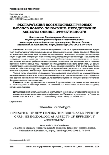 В статье рассматриваются методические подходы к оценке экономического эффекта от эксплуатации грузовых железнодорожных восьмиосных вагонов нового поколения. Отмечено, что изменение количества осей грузового вагона приводит к изменению трудоёмкости его осмотра в пути следования, что приводит к изменению расходов владельца инфраструктуры. Повышение массы грузовых поездов, вызванное увеличением грузоподъёмности восьмиосных вагонов нового поколения, предъявляет новые требования к магистральным локомотивам, так, увеличение массы поезда на Восточном полигоне свыше 7100 т приводит к необходимости использовать дополнительную секцию существующих серий локомотива или новый, более мощный локомотив. Этот фактор существенно влияет на себестоимость грузовых перевозок, что целесообразно учитывать при определении экономического эффекта от эксплуатации грузовых вагонов повышенной грузоподъёмности и осности. Также в статье отмечается, что внедрение грузовых вагонов нового поколения оказывает влияние на экономический результат не только владельца инфраструктуры и владельца (оператора) подвижного состава, но и компании-грузовладельца, приводятся предложения по оценке экономического эффекта для компании-грузовладельца.