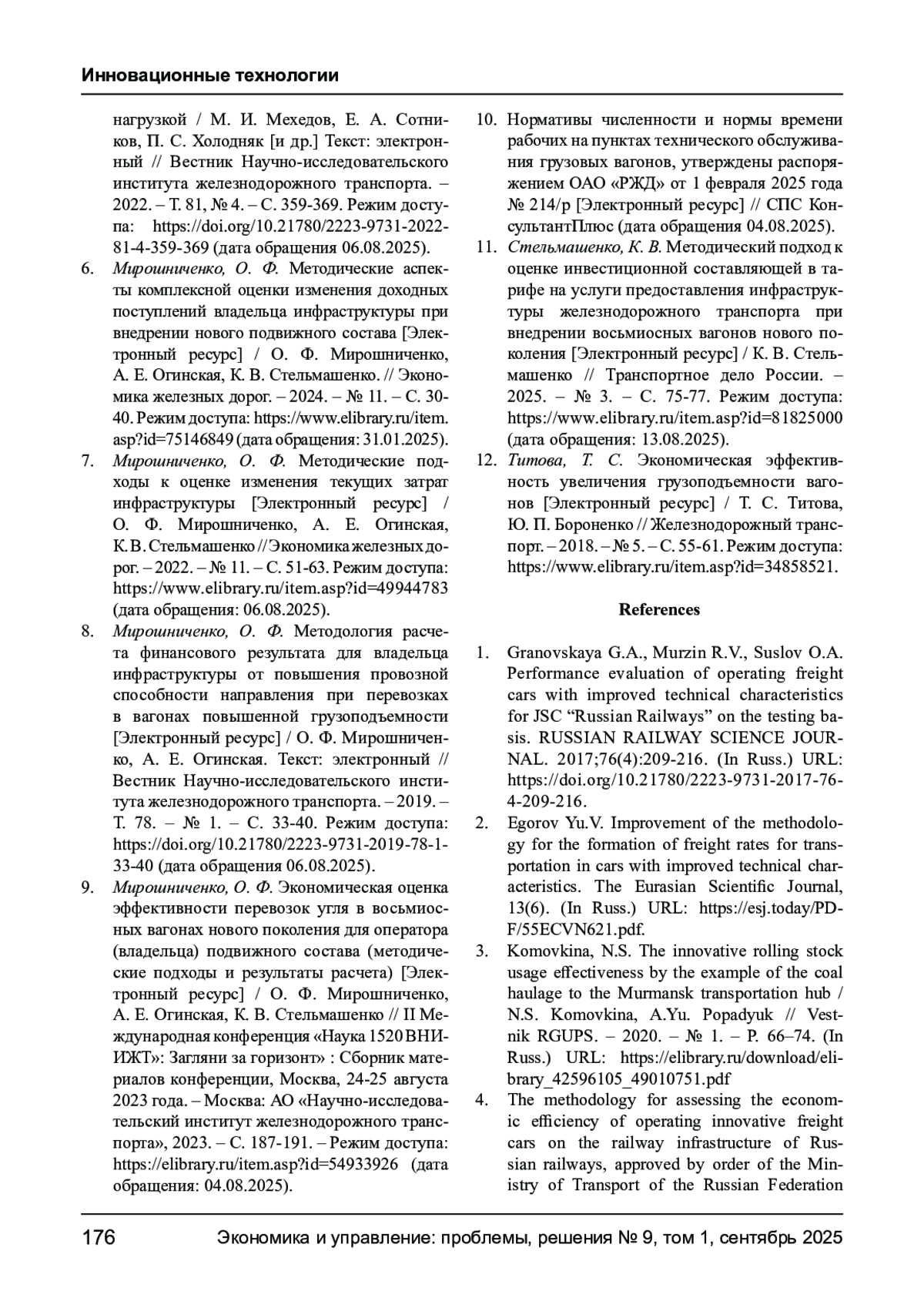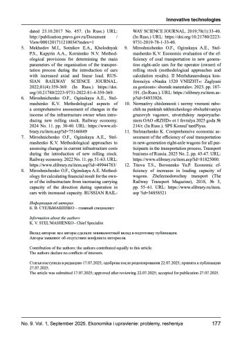 8. Мирошниченко, О. Ф. Методология расчета финансового результата для владельца инфраструктуры от повышения провозной способности направления при перевозках в вагонах повышенной грузоподъемности [Электронный ресурс] / О. Ф. Мирошниченко, А. Е. Огинская. Текст: электронный // Вестник Научно-исследовательского института железнодорожного транспорта. - 2019. - Т. 78. - № 1. - С. 33-40. Режим доступа: 10.21780/2223-9731-2019-78-133-40 (дата обращения 06.08.2025). DOI: 10.21780/2223-9731-2019-78-133-40( EDN: AJBAQK