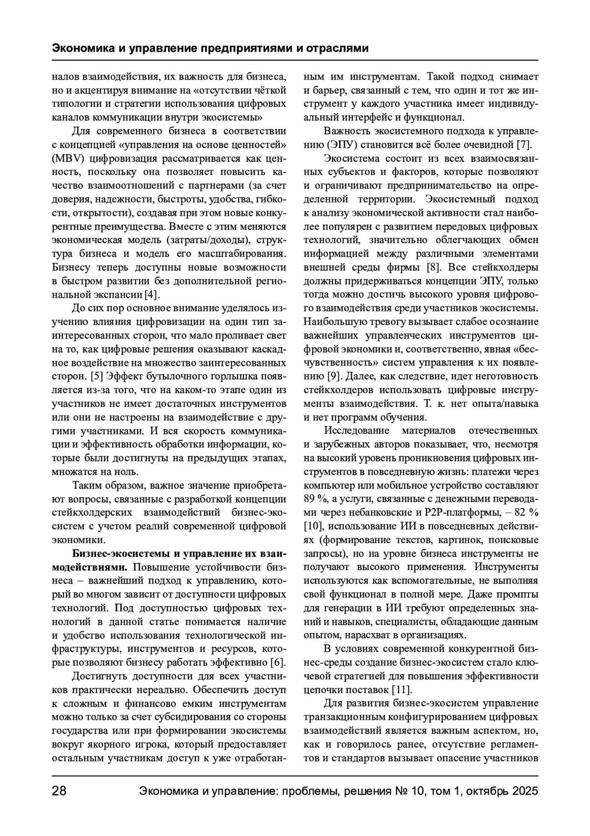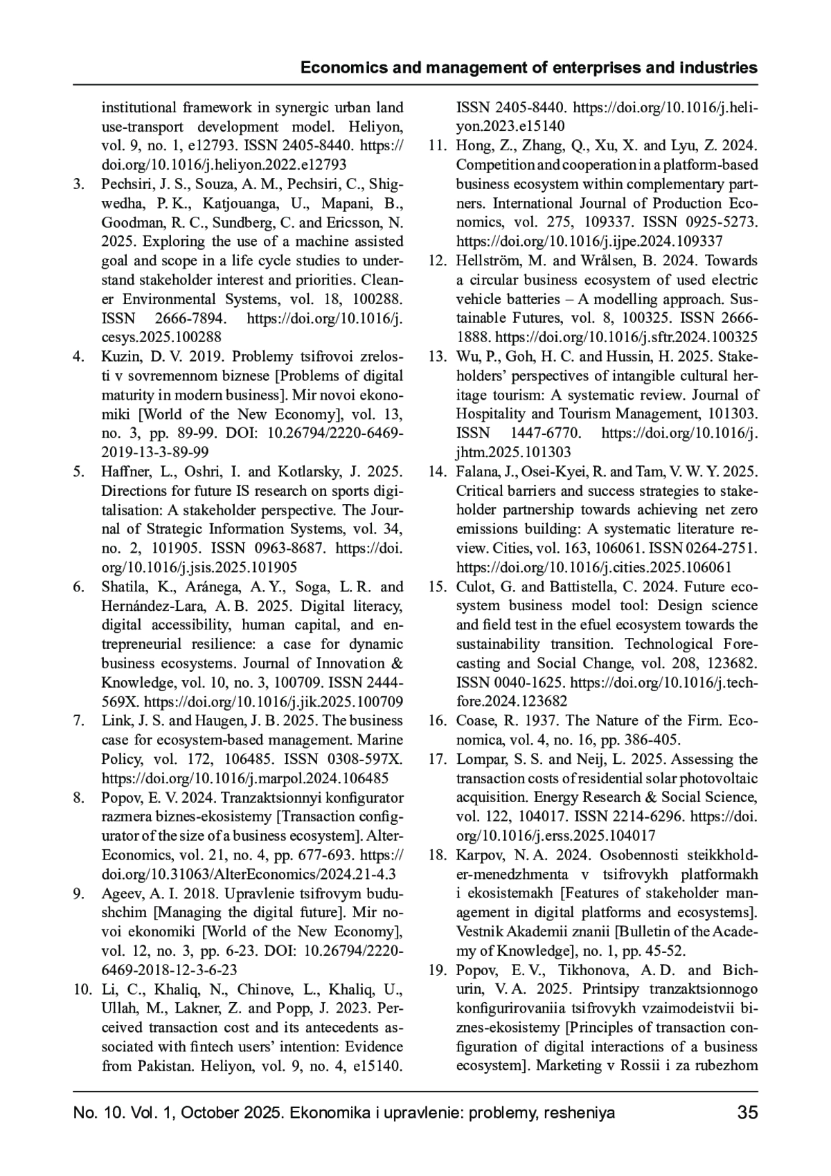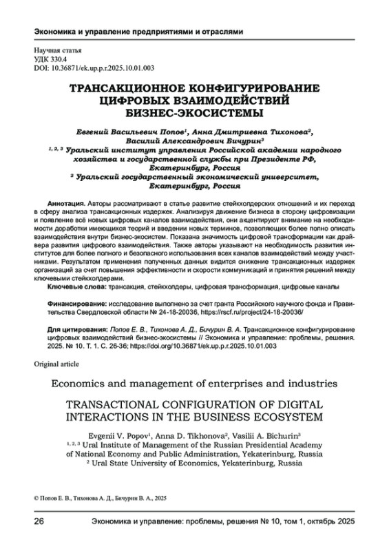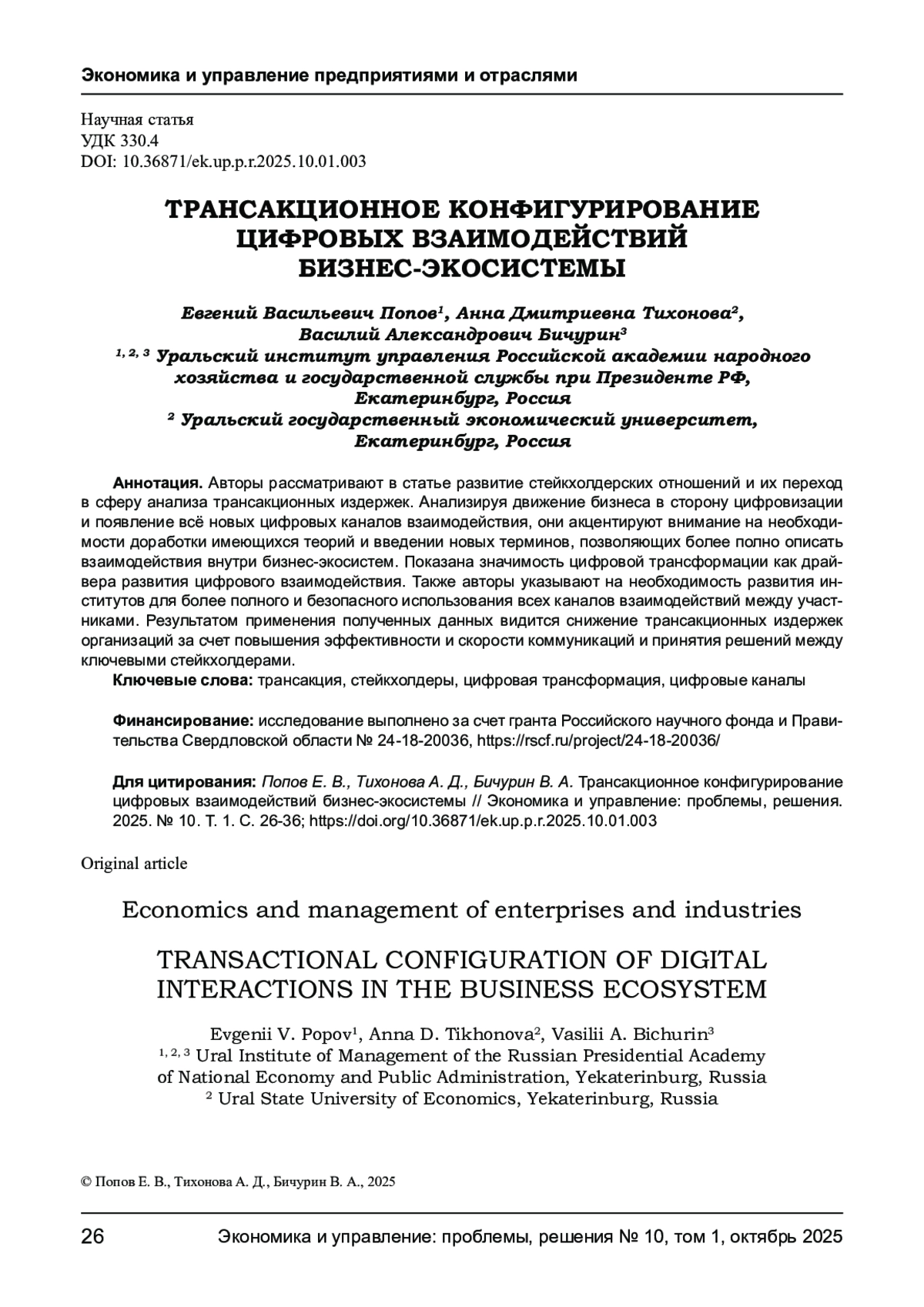 20. Попов Е. В., Тихонова А. Д., Бичурин В. А. Трансакционная конфигурация цифровых преобразований стейкхолдеров бизнес-экосистемы // Журнал прикладных исследований. - 2025. - № 8. - С. 92-104. EDN: IBUEON