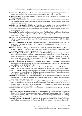 16. D’Errico F., Backwell L. R., Wadley L. Identifying regional variability in Middle Stone Age bone technology: The case of Sibudu Cave // Journal of Archaeological Science. 2012. No. 39. P. 2479-2495.