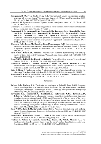 21. Deter-Wolf A., Peres T. M., Karacic S. Ancient Native American bone tattooing tools and pigments: Evidence from central Tennessee // Archaeological Science. 2021. Vol. 37. https://doi.org/10.1016/j.jasrep.2021.103002