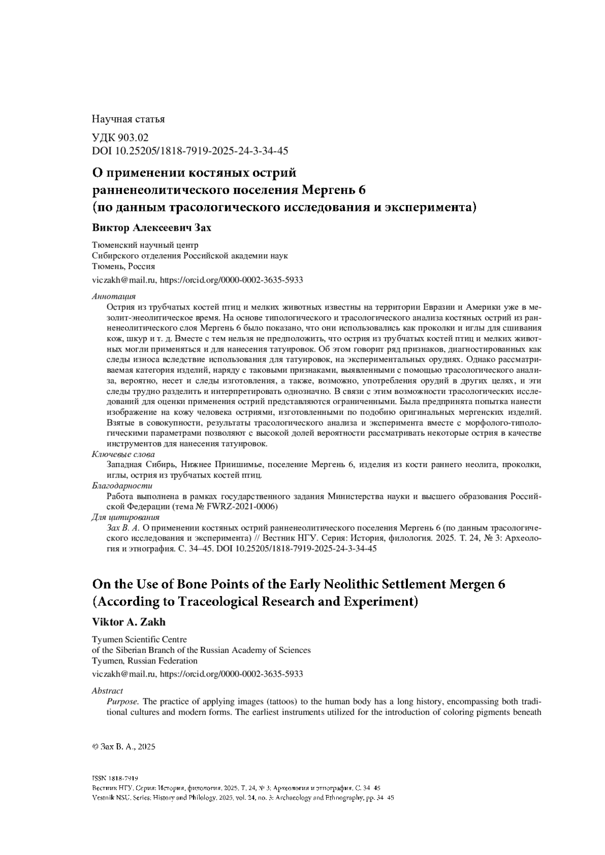 Острия из трубчатых костей птиц и мелких животных известны на территории Евразии и Америки уже в мезолит-энеолитическое время. На основе типологического и трасологического анализа костяных острий из ранненеолитического слоя Мергень 6 было показано, что они использовались как проколки и иглы для сшивания кож, шкур и т. д. Вместе с тем нельзя не предположить, что острия из трубчатых костей птиц и мелких животных могли применяться и для нанесения татуировок. Об этом говорит ряд признаков, диагностированных как следы износа вследствие использования для татуировок, на экспериментальных орудиях. Однако рассматриваемая категория изделий, наряду с таковыми признаками, выявленными с помощью трасологического анализа, вероятно, несет и следы изготовления, а также, возможно, употребления орудий в других целях, и эти следы трудно разделить и интерпретировать однозначно. В связи с этим возможности трасологических исследований для оценки применения острий представляются ограниченными. Была предпринята попытка нанести изображение на кожу человека остриями, изготовленными по подобию оригинальных мергенских изделий. Взятые в совокупности, результаты трасологического анализа и эксперимента вместе с морфолого-типологическими параметрами позволяют с высокой долей вероятности рассматривать некоторые острия в качестве инструментов для нанесения татуировок.