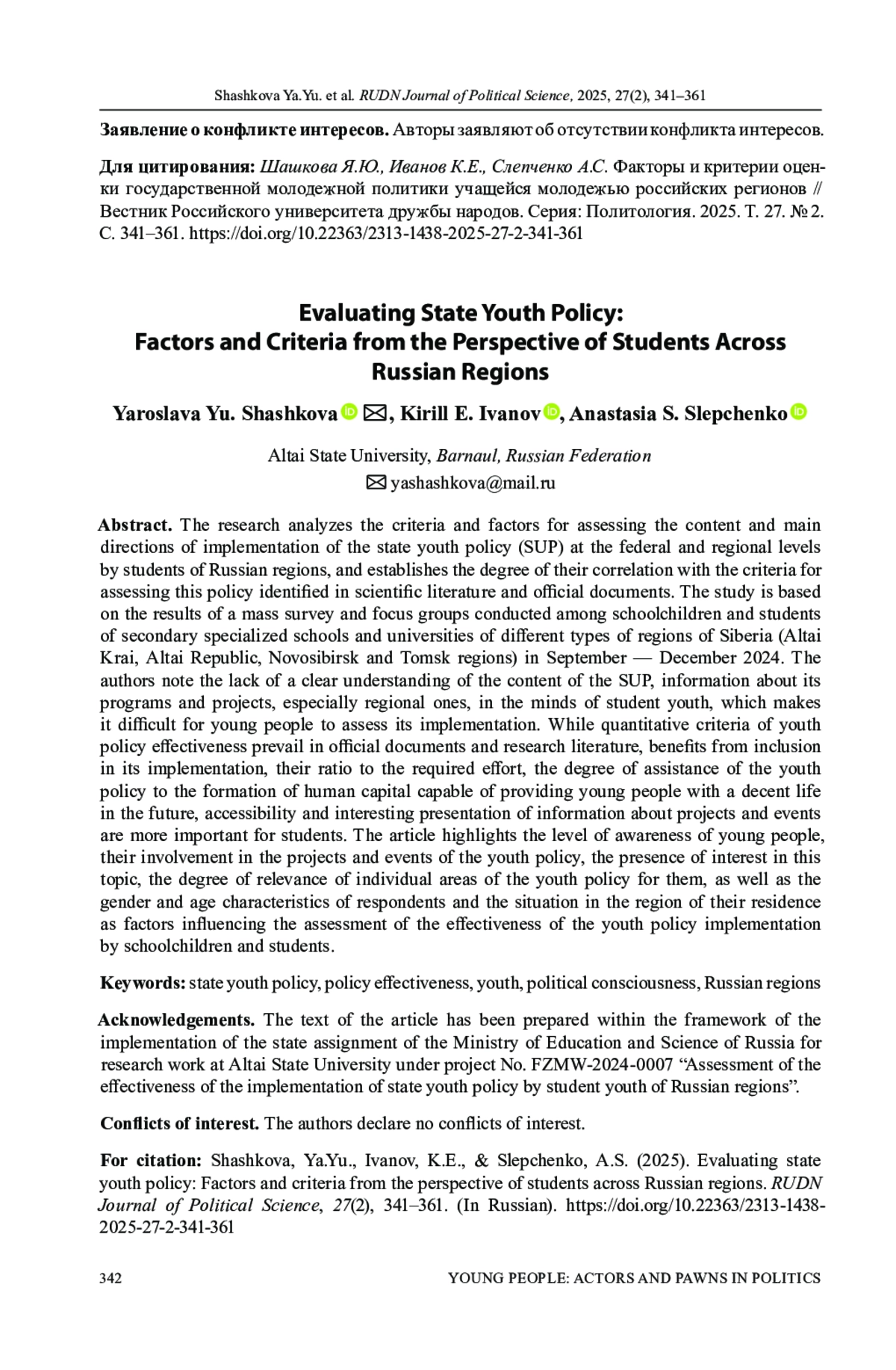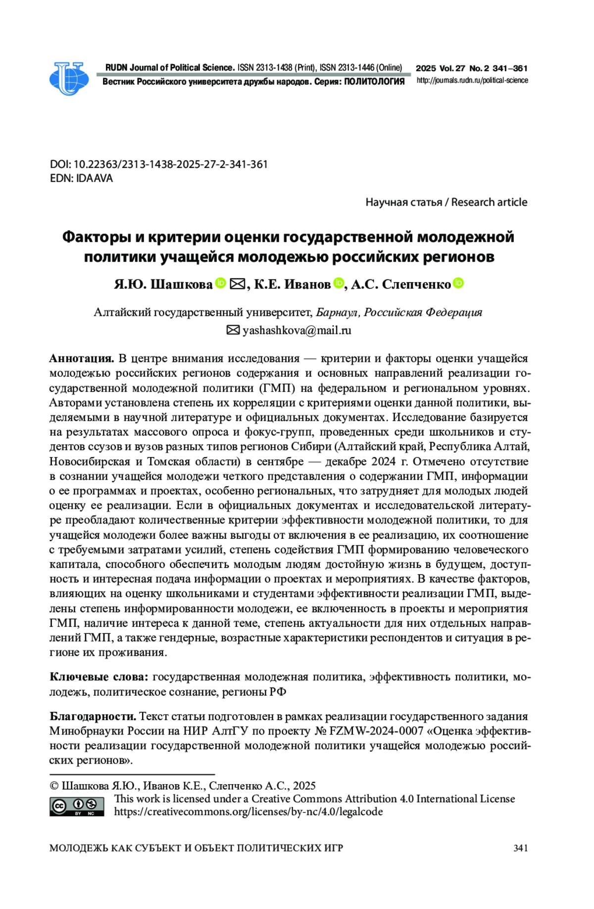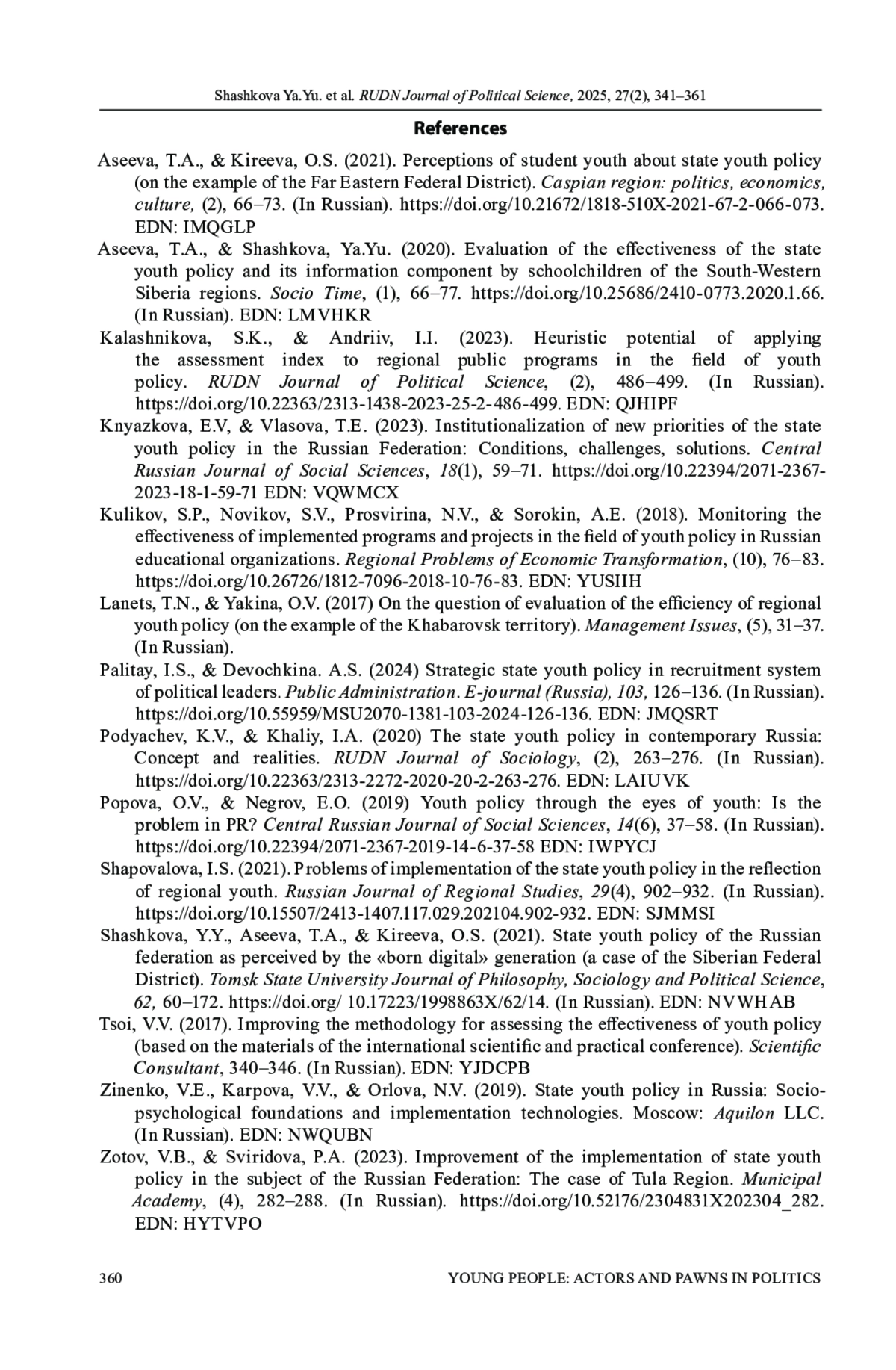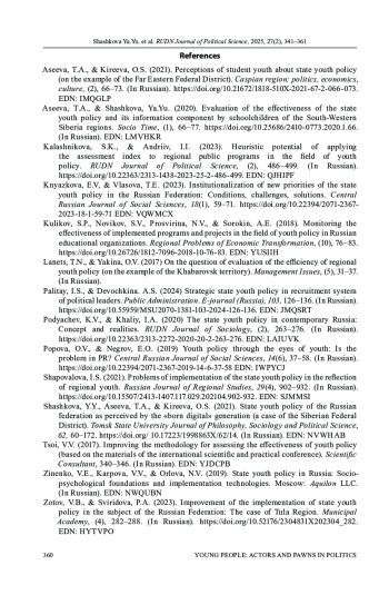 5. Калашникова С.К., Андриив И.И. Эвристический потенциал применения индекса оценки региональных государственных программ в сфере молодежной поли-тики // Вестник Российского университета дружбы народов. Серия: Политология. 2023. Т. 25, № 2. С. 486-499. DOI: 10.22363/2313-1438-2023-25-2-486-499 EDN: QJHIPF