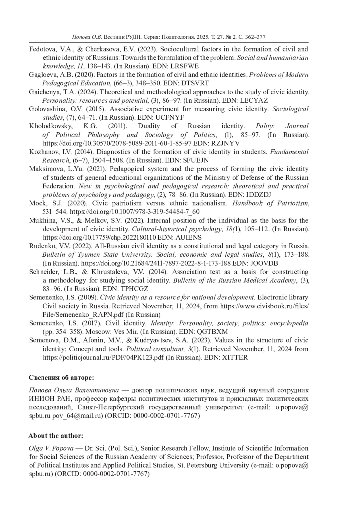 17. Семененко И.С. Гражданская идентичность как ресурс национального развития // Электронная библиотека Гражданское общество в России. 2009. URL: https://www.civisbook.ru/files/File/Semenenko_RAPN.pdf (дата обращения: 11.11.2024). EDN: XMAQIO