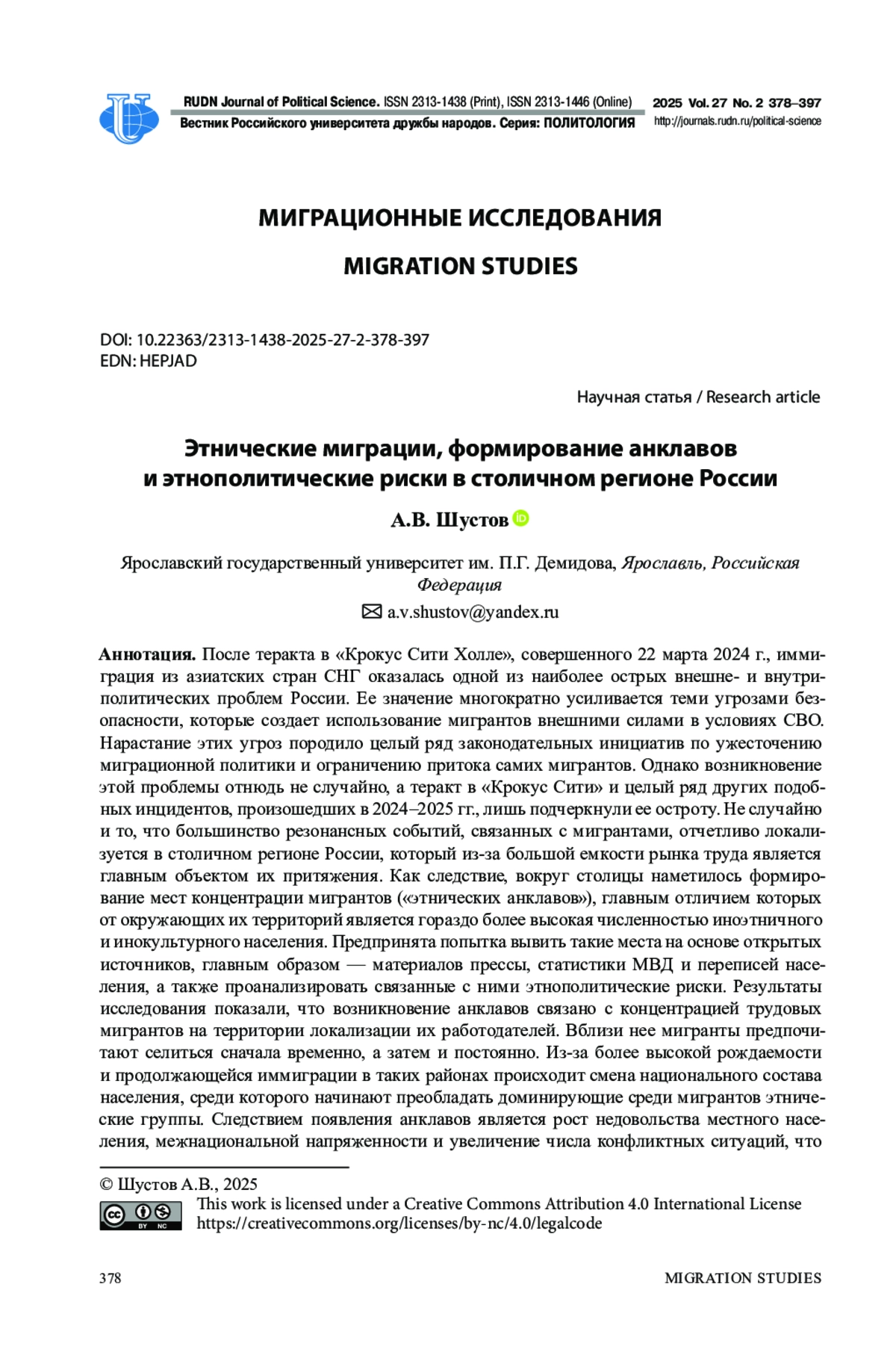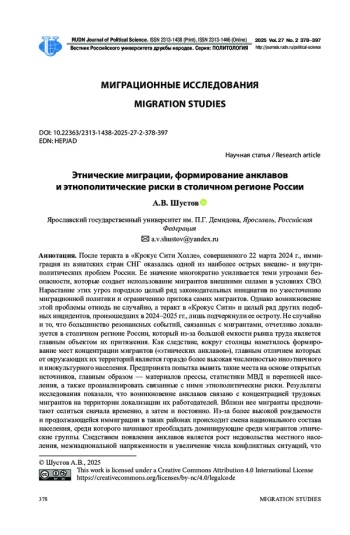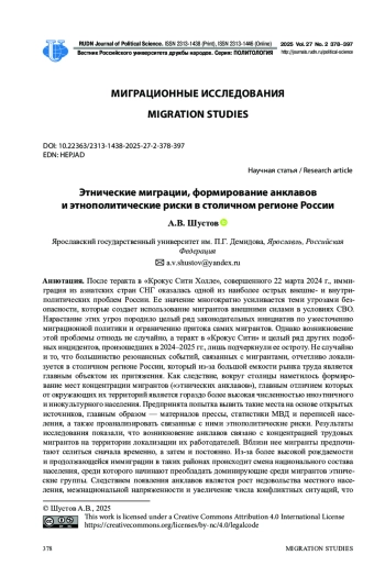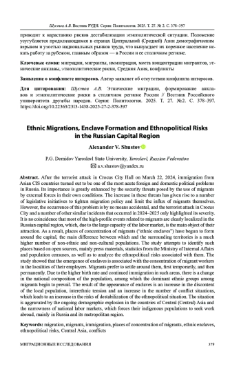 После теракта в «Крокус Сити Холле», совершенного 22 марта 2024 г., иммиграция из азиатских стран СНГ оказалась одной из наиболее острых внешне- и внутриполитических проблем России. Ее значение многократно усиливается теми угрозами безопасности, которые создает использование мигрантов внешними силами в условиях СВО. Нарастание этих угроз породило целый ряд законодательных инициатив по ужесточению миграционной политики и ограничению притока самих мигрантов. Однако возникновение этой проблемы отнюдь не случайно, а теракт в «Крокус Сити» и целый ряд других подобных инцидентов, произошедших в 2024-2025 гг., лишь подчеркнули ее остроту. Не случайно и то, что большинство резонансных событий, связанных с мигрантами, отчетливо локализуется в столичном регионе России, который из-за большой емкости рынка труда является главным объектом их притяжения. Как следствие, вокруг столицы наметилось формирование мест концентрации мигрантов («этнических анклавов»), главным отличием которых от окружающих их территорий является гораздо более высокая численностью иноэтничного и инокультурного населения. Предпринята попытка вывить такие места на основе открытых источников, главным образом - материалов прессы, статистики МВД и переписей населения, а также проанализировать связанные с ними этнополитические риски. Результаты исследования показали, что возникновение анклавов связано с концентрацией трудовых мигрантов на территории локализации их работодателей. Вблизи нее мигранты предпочитают селиться сначала временно, а затем и постоянно. Из-за более высокой рождаемости и продолжающейся иммиграции в таких районах происходит смена национального состава населения, среди которого начинают преобладать доминирующие среди мигрантов этнические группы. Следствием появления анклавов является рост недовольства местного населения, межнациональной напряженности и увеличение числа конфликтных ситуаций, что приводит к нарастанию рисков дестабилизации этнополитической ситуации. Положение усугубляется продолжающимся в странах Центральной (Средней) Азии демографическим взрывом и узостью национальных рынков труда, что вынуждает их коренное население искать работу за рубежом, главным образом - в России и ее столичном регионе.