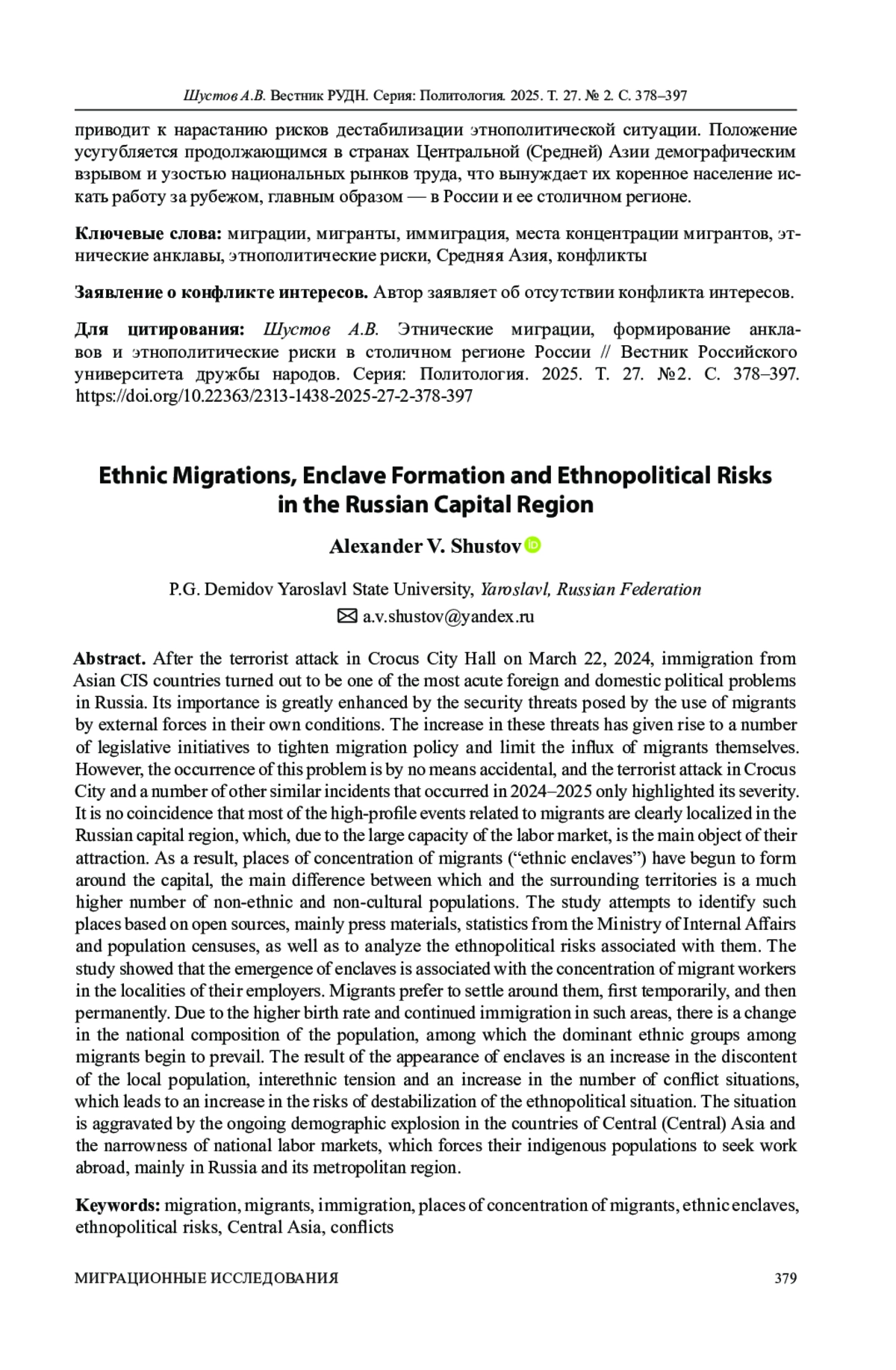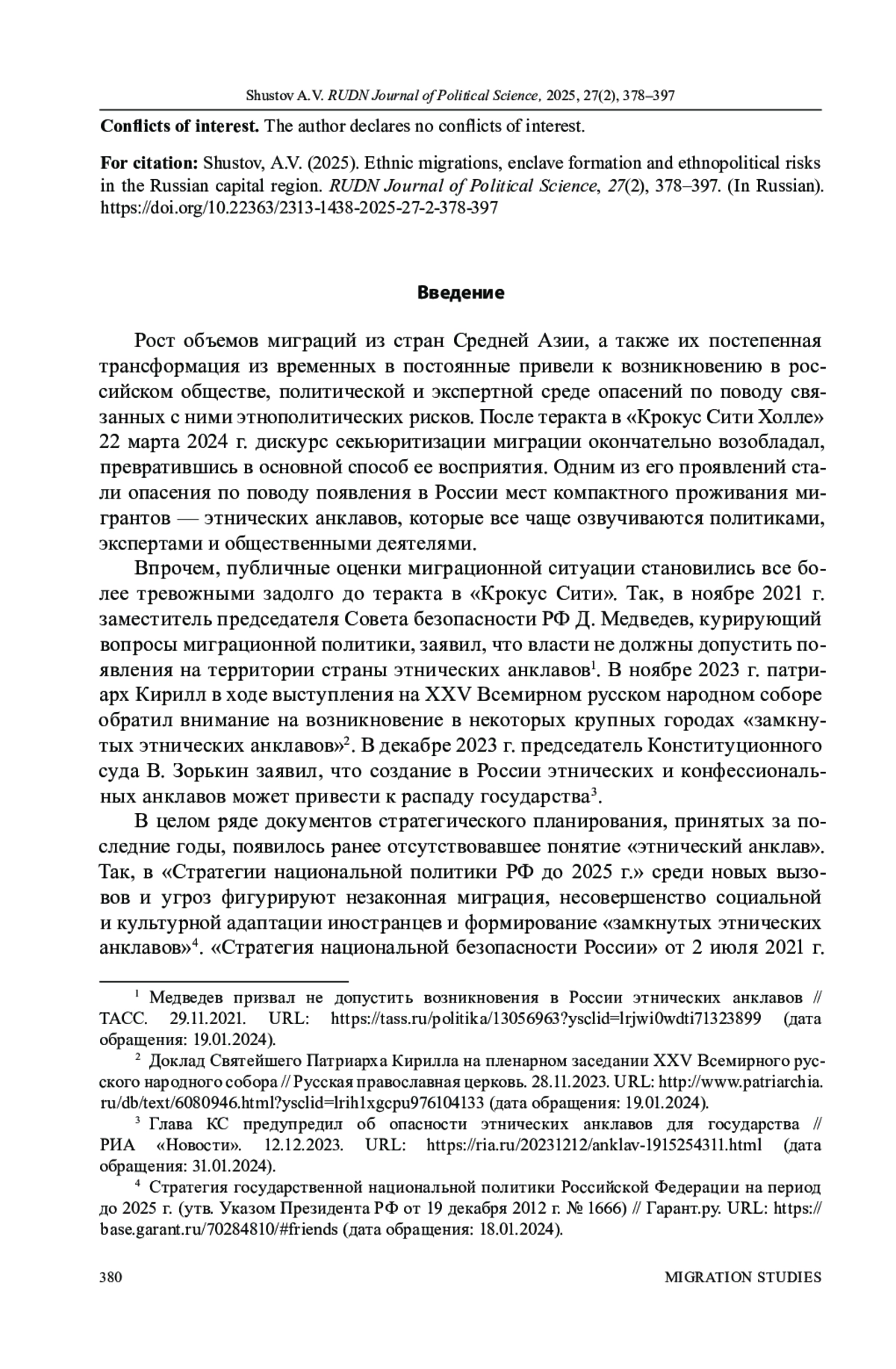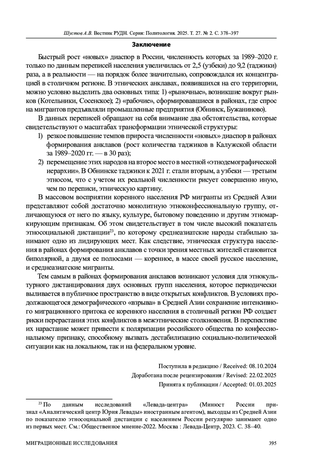 10. Шустов А.В. Контуры миграционного кризиса 2020-2022 гг. в России // Социологические исследования. 2023. № 4. С. 51-64. DOI: 10.31857/S013216250023213-7 EDN: PIUJTM