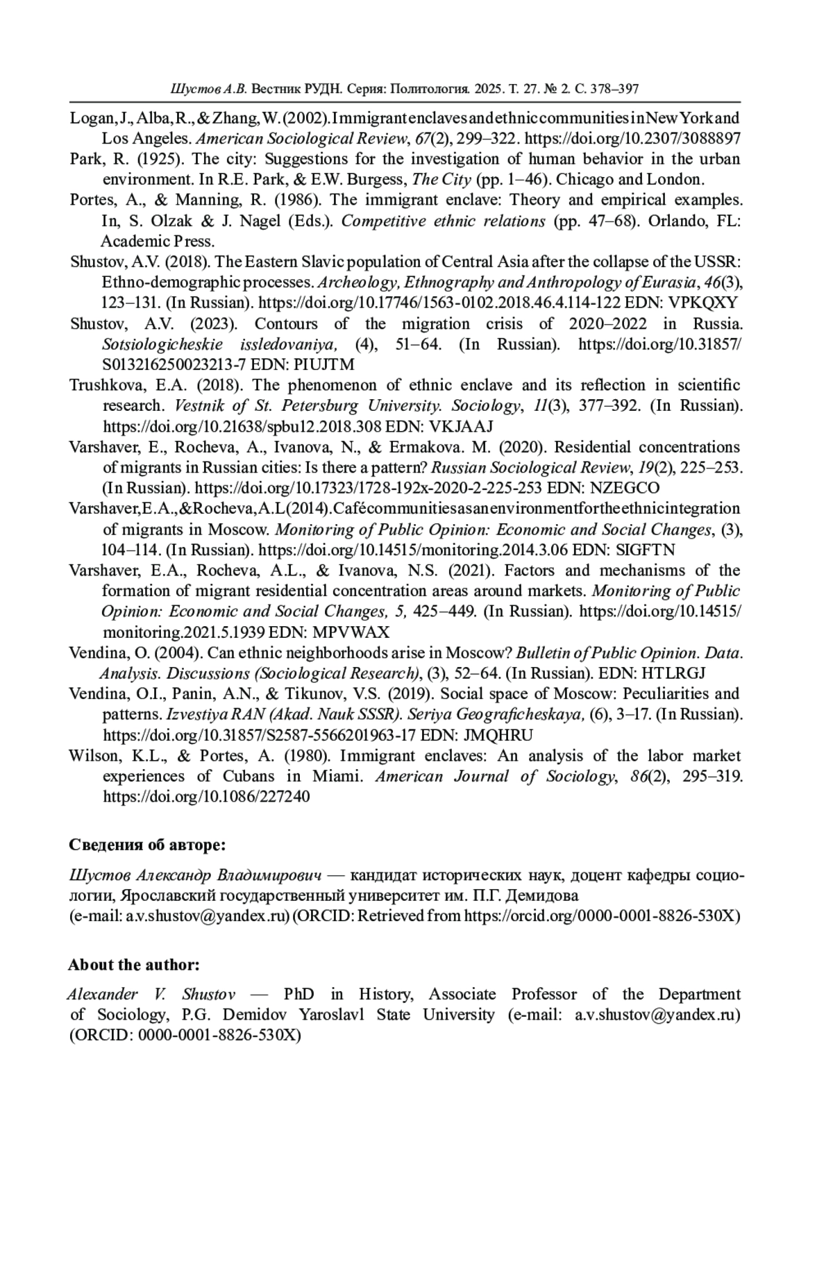 2. Варшавер Е., Рочева А., Иванова Н., Ермакова М. Места резидентной концентрации мигрантов в российских городах: есть ли паттерн? // Социологическое обозрение. 2020. Т. 19. № 2. С. 225-253. DOI: 10.17323/1728-192x-2020-2-225-253 EDN: NZEGCO