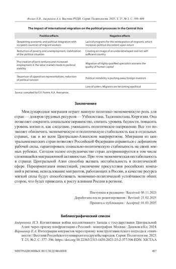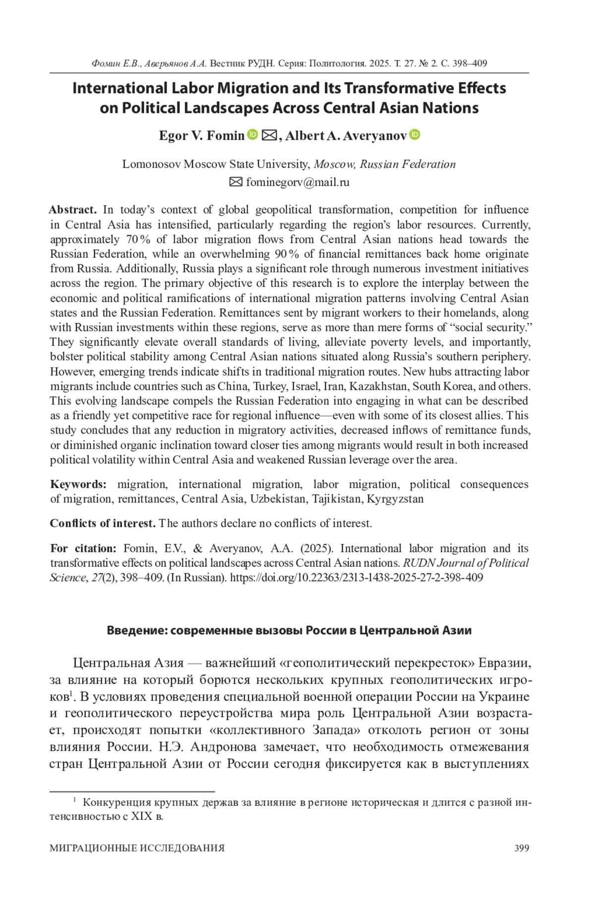 В современных условиях геополитического переустройства мира борьба за влияние в Центральной Азии усиливается, возрастает конкуренция за трудовые ресурсы региона. На сегодняшний день основным направлением миграции рабочей силы из центральноазиатских стран является Российская Федерация (около 70 %), большинство денежных переводов в страны Центральной Азии также происходит из России (до 90 % всех денежных переводов), Россия участвует во многих инвестиционных проектах в регионе. Цель исследования - показать связь между экономическими и политическими последствиями международной миграции из стран Центральной Азии в Российскую Федерацию. Денежные переводы мигрантов на родину и российские инвестиции в регион являются не просто «социальной страховкой», т. е. позволяют повысить средний уровень жизни и сократить бедность, но еще и способствуют поддержанию политической стабильности в странах Центральной Азии - на южных рубежах Российской Федерации. В то же время происходит формирование новых миграционных коридоров. Центрами притяжения становятся Китай, Турция, Израиль, Иран, Казахстан, Южная Корея и другие страны. Российская Федерация вынуждена участвовать в «дружеском соперничестве» и за влияние в регионе, и за трудовые ресурсы даже со своими партнерами. Авторами сделан вывод, что снижение миграционной активности, потока денежных переводов, стихийного запроса на сближение стран со стороны мигрантов ведет к политической нестабильности в Центральной Азии и уменьшению влияния России в регионе.