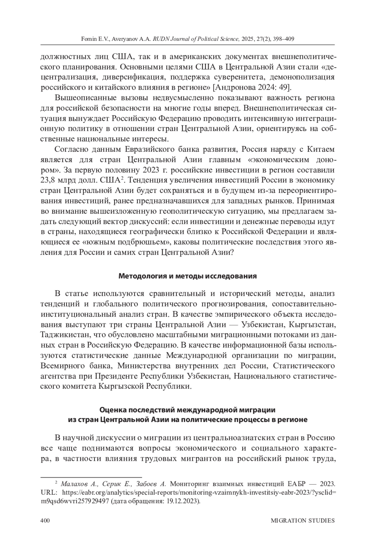 2. Варшавер Е.А. Интеграция мигрантов через призму конструктивистского подхода к этничности // Вестник Российского университета дружбы народов. Серия: Политология. 2023. Т. 25, № 2. С. 377-396. DOI: 10.22363/2313-1438-2023-25-2-377-396 EDN: XICTAA