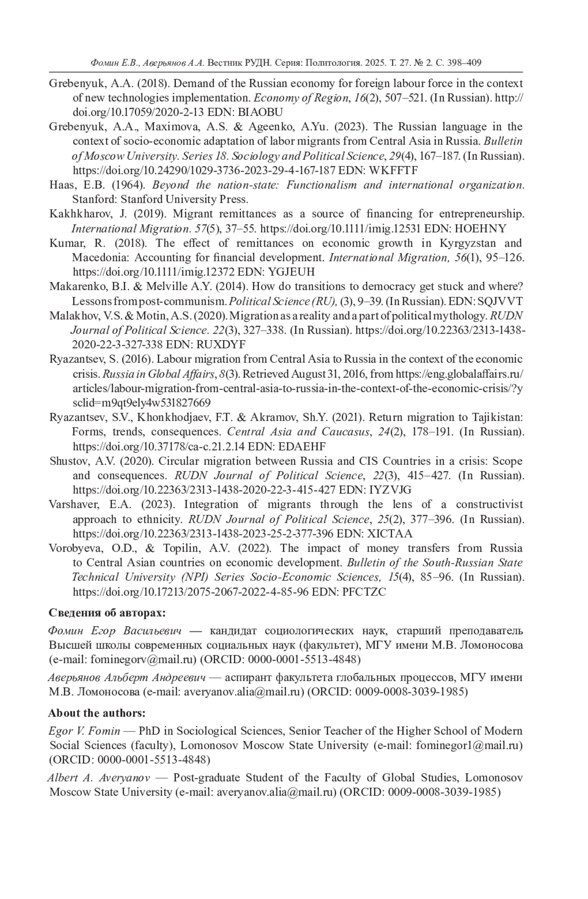 11. Шустов А.В. Циркулярные миграции между Россией и странами СНГ в условиях кризиса: масштабы и последствия // Вестник Российского университета дружбы народов. Серия: Политология. 2020. Т. 22, № 3. С. 415-427. DOI: 10.22363/2313-1438-2020-22-3-415-427 EDN: IYZVJG