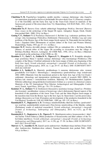 17. Косинцев П. А., Стефанов В. И. Особенности хозяйства населения лесного Зауралья и Приишимской лесостепи в переходное время от бронзового века к железному // Становление и развитие производящего хозяйства на Урале. Свердловск: Изд-во УрО АН СССР, 1989. С. 105-119.