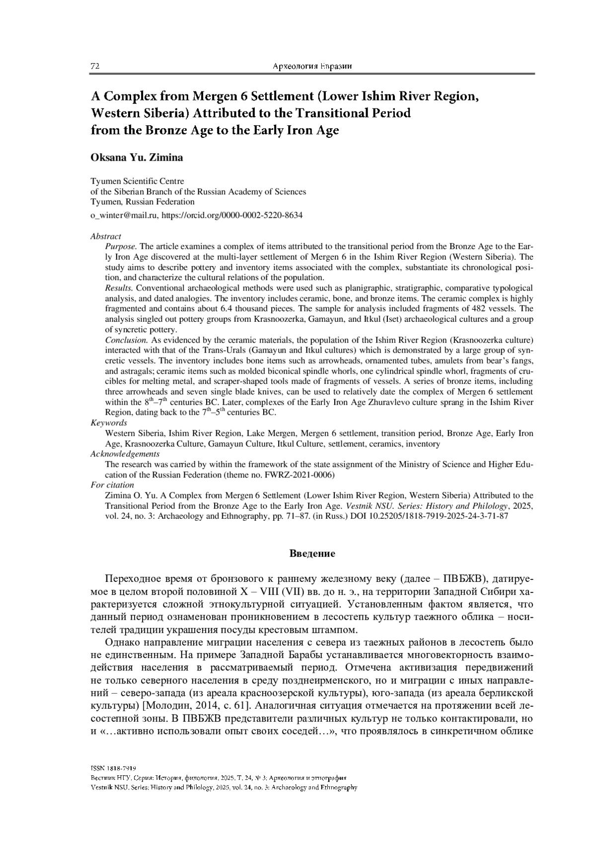 14. Зимина О. Ю., Зах В. А., Скочина С. Н. Керамический комплекс переходного времени от бронзы к железу поселения Мергень 6 в Нижнем Приишимье (Западная Сибирь) // Вестник археологии, антропологии и этнографии. 2023. № 4 (63). С. 120-133 https://doi.org/10.20874/2071-0437-2023-63-4-9