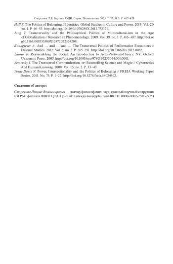 15. Hall S. The Politics of Belonging // Identities: Global Studies in Culture and Power. 2013. Vol. 20, no. 1. P. 46-53. DOI: 10.1080/1070289X.2012.752371