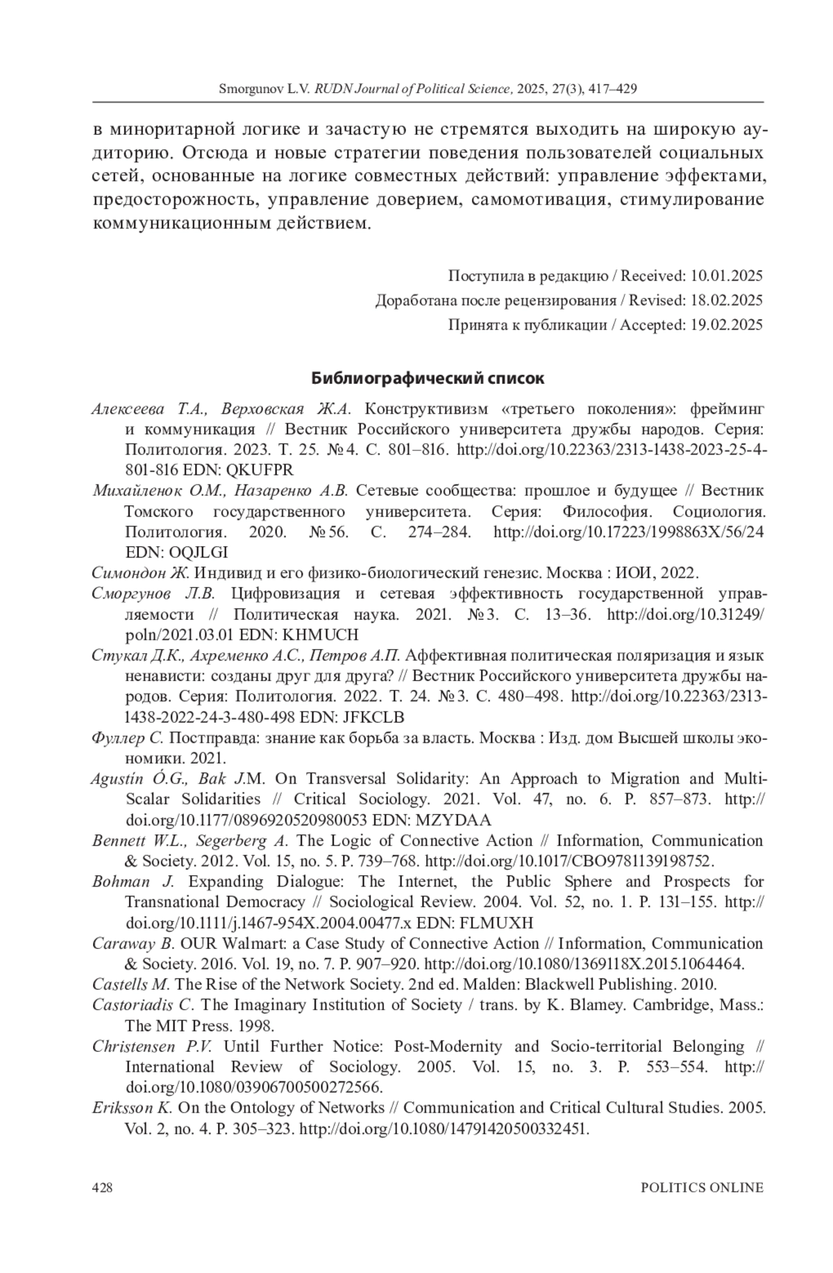 В современных условиях, когда сетевое пространство активно используется человеком как источник информации и коммуникации, взаимодействие онлайн выступает мощным средством формирования политических ценностей и идентичностей, влияющих на политическое позиционирование и деятельность. В процессе сетевого взаимодействия проявляются механизмы управляемой и неуправляемой убеждающей коммуникации. Важным свойством такого взаимодействия выступает политика трансверсальности, т. е. стратегия взаимосогласования и взаимопересечения социальных, культурных, поколенческих, территориальных и других различий.