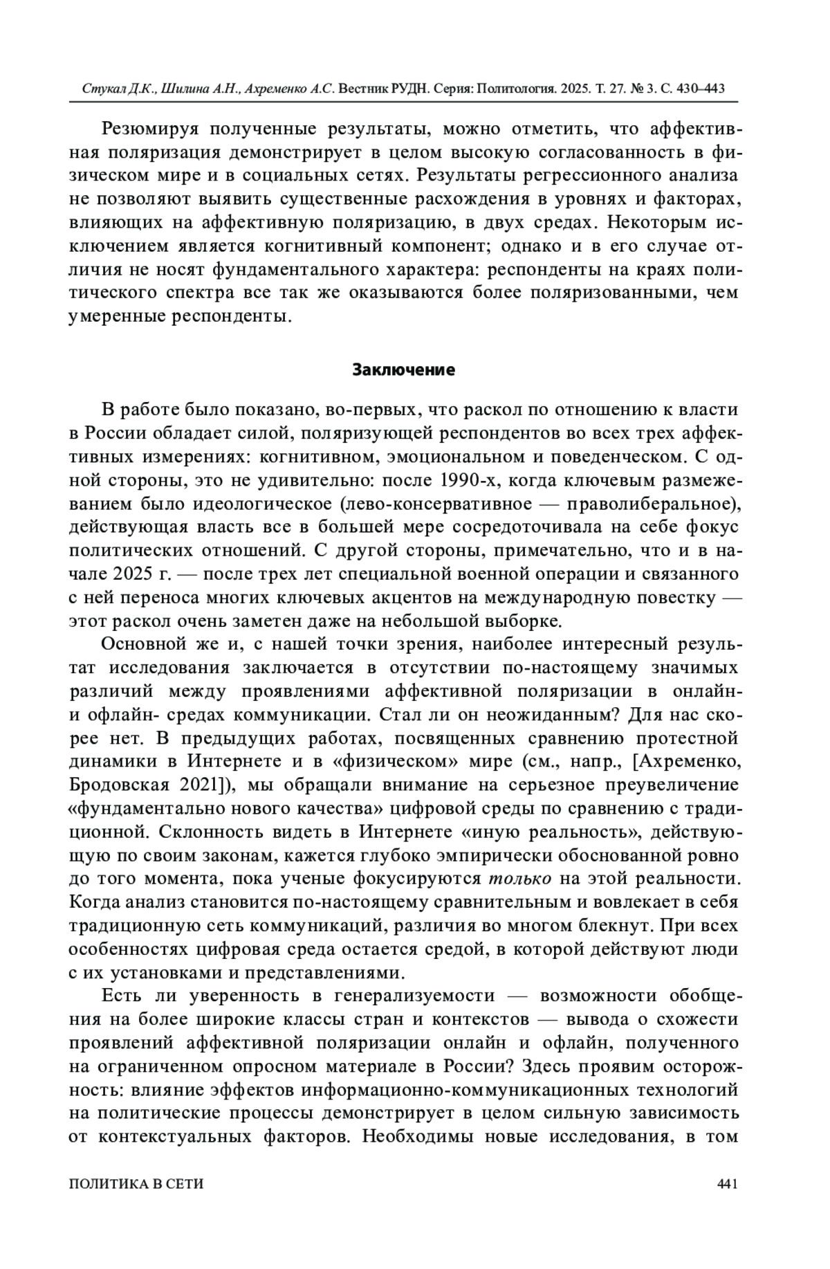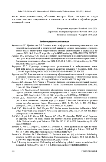 7. Стукал Д.К., Ахременко А.С., Петров А.П. Аффективная политическая поляризация и язык ненависти: созданы друг для друга? // Вестник Российского университета дружбы народов. Серия: Политология. 2022. Т. 24, № 3. С. 480-498. DOI: 10.22363/2313-1438-2022-24-3-480-498 EDN: VLTQRN