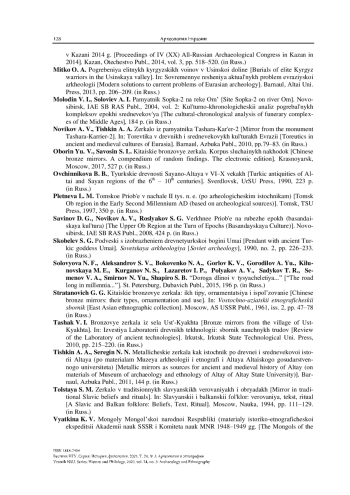 35. Ташак В. И. Бронзовые зеркала из села Усть-Кяхта // Изв. Лаборатории древних технологий 2019. № 4. С. 215-220.