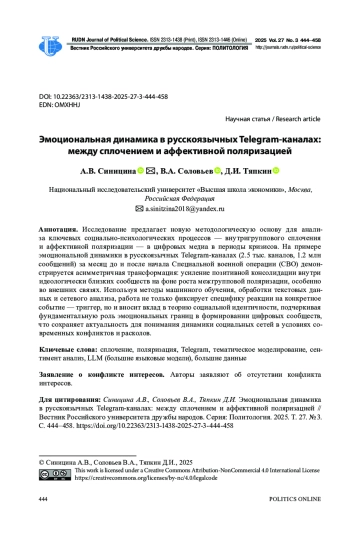3. Соловьев В.А. Динамика идеологической поляризации в пространстве русскоязычных Telegram-каналов: моделирование методами машинного обучения // Политическая наука. 2025. № 1. С. 240-259. http://www. DOI: 10.31249/poln/2025.01.11 EDN: MXKGQO