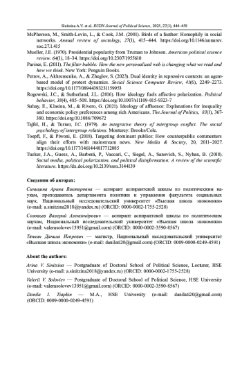 1. Ахременко А.С., Синицина А.В., Соловьев В.А. Размежевание или сплочение? Динамика сетевой структуры политических телеграм-каналов: моделирование и эмпирический анализ // Полития: Анализ. Хроника. Прогноз. 2024. № 3. С. 59-81. ;. DOI: 10.30570/2078-5089-2024-114-3-59-81 EDN: VLMIWE