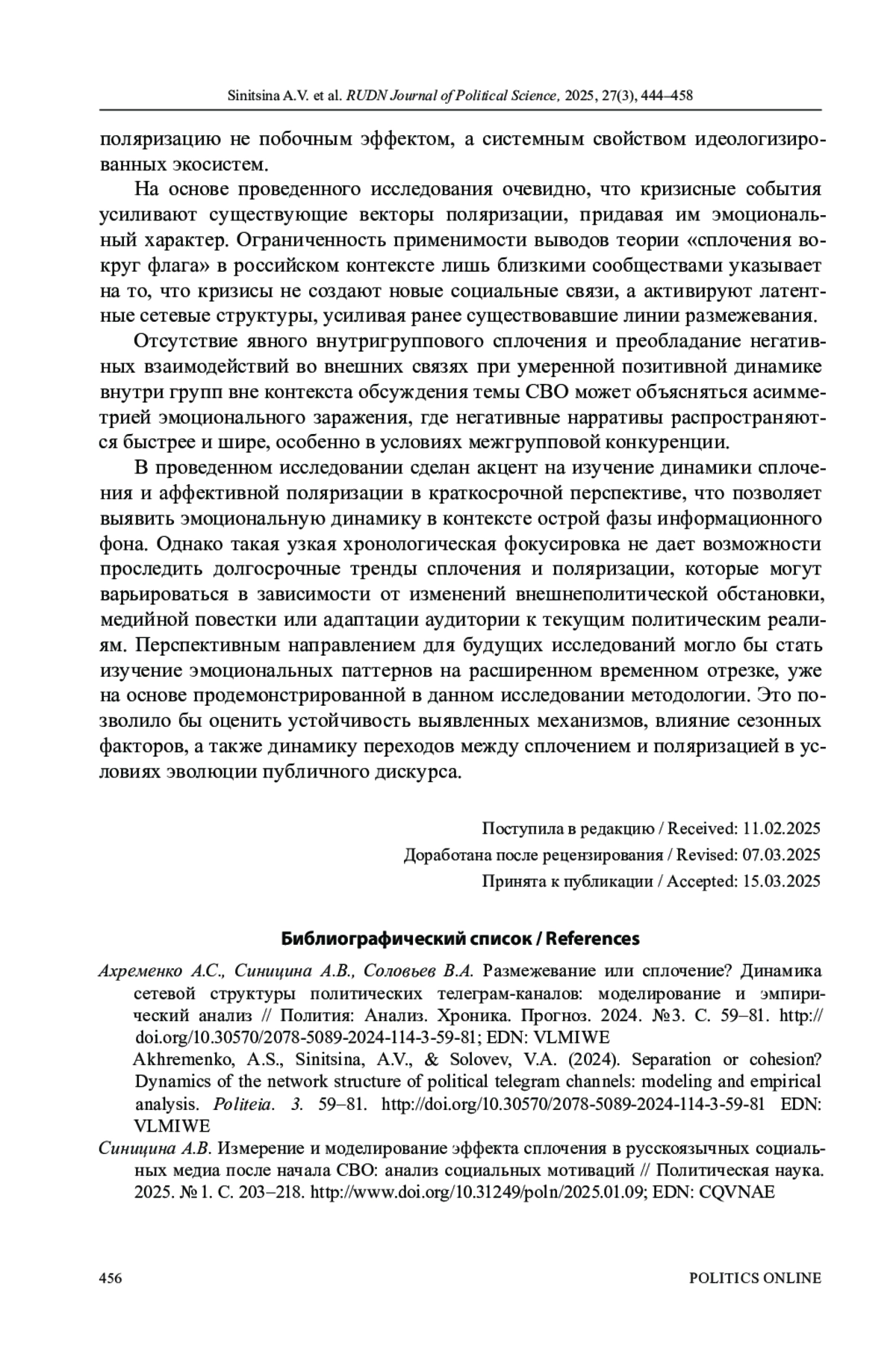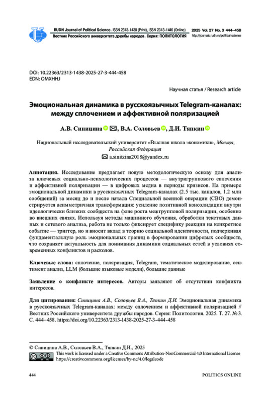 2. Синицина А.В. Измерение и моделирование эффекта сплочения в русскоязычных социальных медиа после начала СВО: анализ социальных мотиваций // Политическая наука. 2025. № 1. С. 203-218. http://www.;. DOI: 10.31249/poln/2025.01.09 EDN: CQVNAE