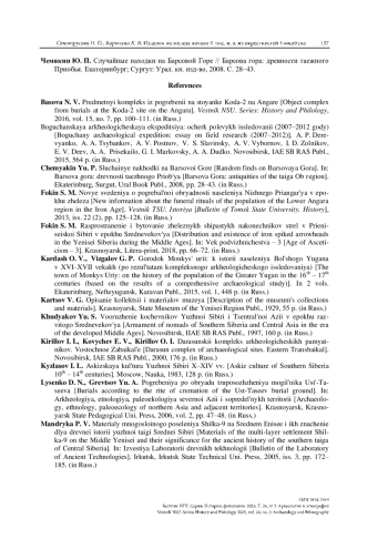 21. Фокин С. М. Новые сведения о погребальной обрядности населения Нижнего Приангарья в эпоху железа // Вестник Том. гос. ун-та. История. 2013. № 22 (2). С. 125-128.