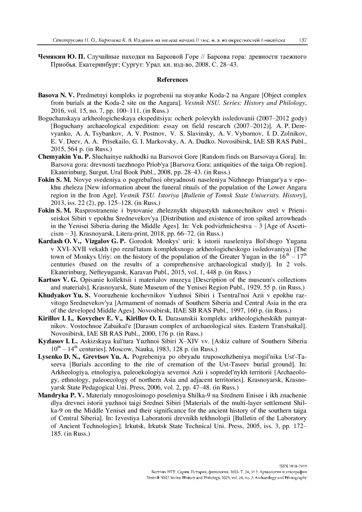 10. Мандрыка П. В., Сенотрусова П. О. Культурная принадлежность памятников развитого Средневековья южнотаежной зоны Средней Сибири // РА. 2018. № 2. С. 98-112.