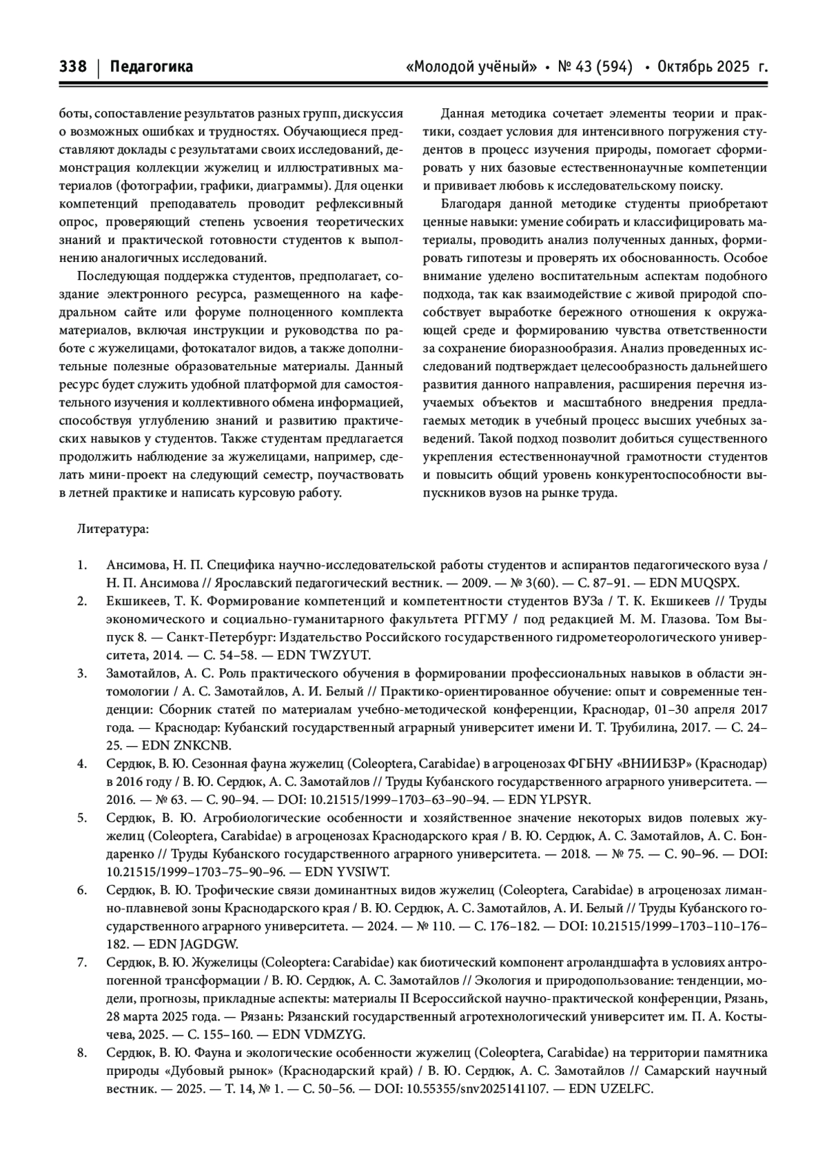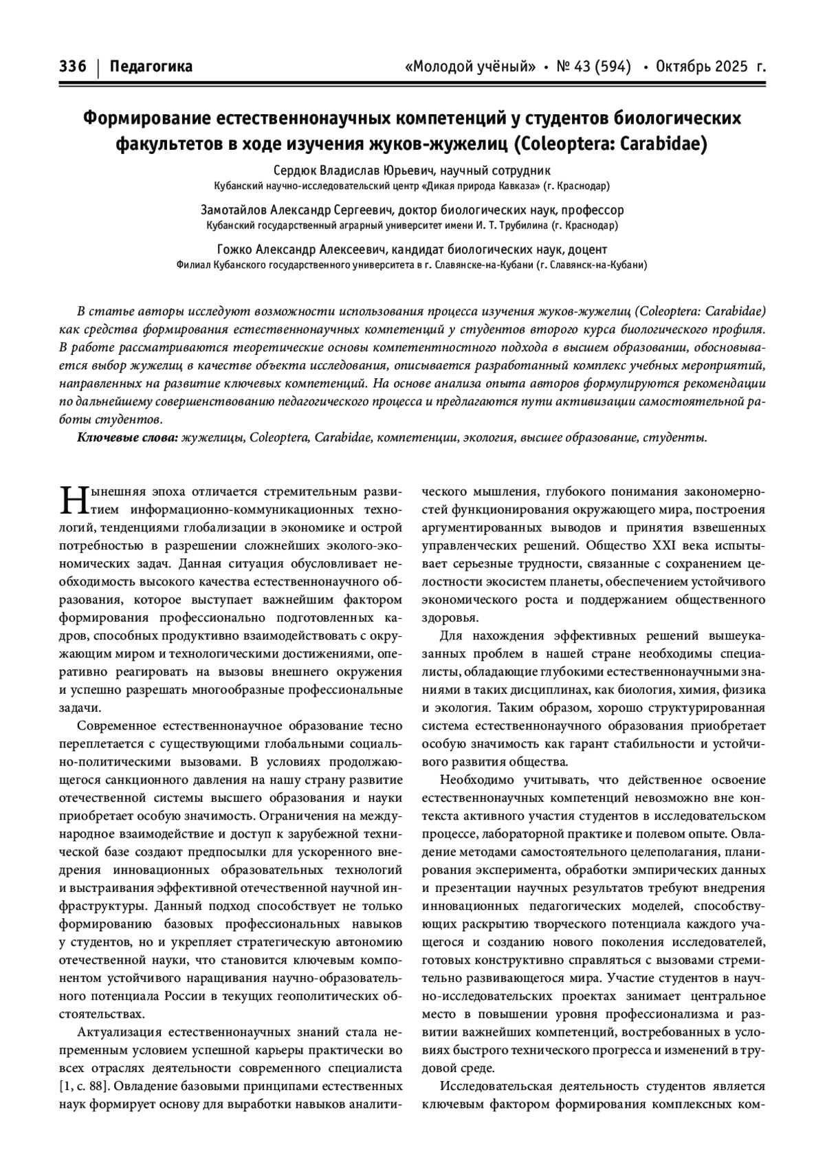 СЕРДЮК В. Ю., ЗАМОТАЙЛОВ А. С., ГОЖКО А. А. ФОРМИРОВАНИЕ ЕСТЕСТВЕННОНАУЧНЫХ КОМПЕТЕНЦИЙ У СТУДЕНТОВ БИОЛОГИЧЕСКИХ ФАКУЛЬТЕТОВ В ХОДЕ ИЗУЧЕНИЯ ЖУКОВ-ЖУЖЕЛИЦ (COLEOPTERA: CARABIDAE)
