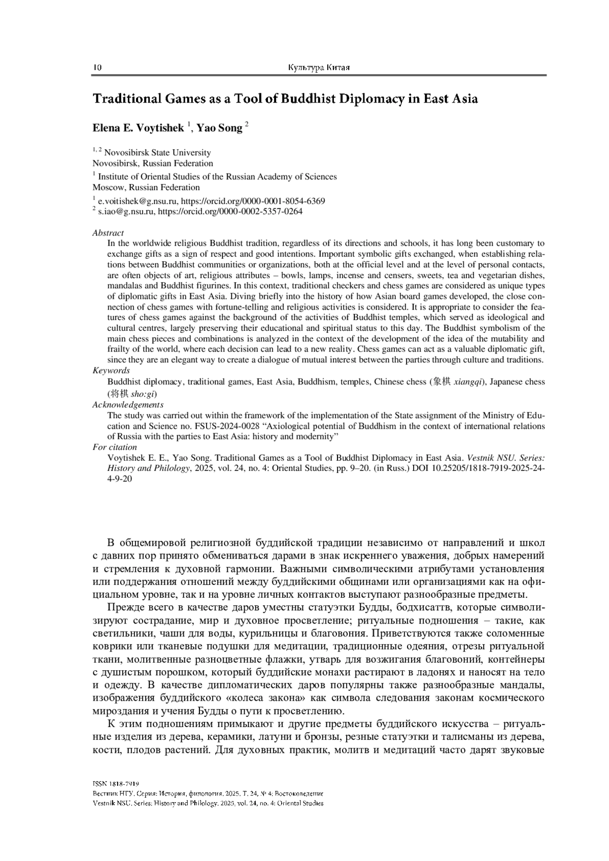 В общемировой религиозной буддийской традиции независимо от направлений и школ с давних пор принято обмениваться дарами в знак уважения и добрых намерений. Важными символическими дарами при установлении отношений между буддийскими общинами или организациями как на официальном уровне, так и на уровне личных контактов выступают предметы искусства, религиозные атрибуты – чаши, светильники, благовония и курильницы, сладости, чай и вегетарианские блюда, мандалы и буддийские статуэтки. В этом контексте как оригинальные виды дипломатических подарков в Восточной Азии рассмотрены традиционные шашечные и шахматные игры. Через краткий экскурс в историю развития азиатских стратегических игр на доске рассмотрена тесная связь шахматных игр с гадательной и религиозной деятельностью. Особенности шахматных игр целесообразно рассматривать на фоне деятельности буддийских храмов, выполнявших роль идеологических и культурных центров, во многом сохраняющих свой образовательный и духовный статус и поныне. Буддийская символика основных шахматных фигур и комбинаций проанализирована в контексте развития идеи об изменчивости и бренности мира, где каждое решение может привести к новой реальности. Шахматные игры могут выступить в качестве ценного дипломатического подарка, поскольку представляяют собой элегантный способ выстроить заинтересованный диалог сторон через культуру и традиции.