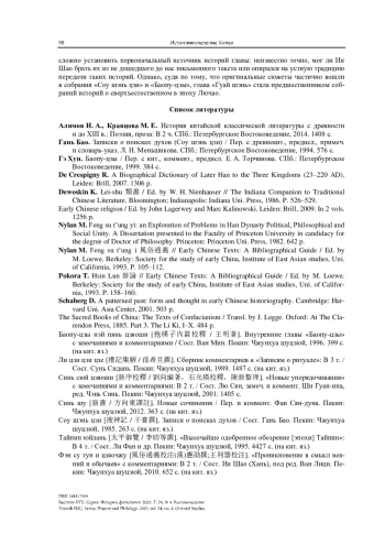 1. Алимов И. А., Кравцова М. Е. История китайской классической литературы с древности и до XIII в.: Поэзия, проза: В 2 ч. СПб.: Петербургское Востоковедение, 2014. 1408 с.