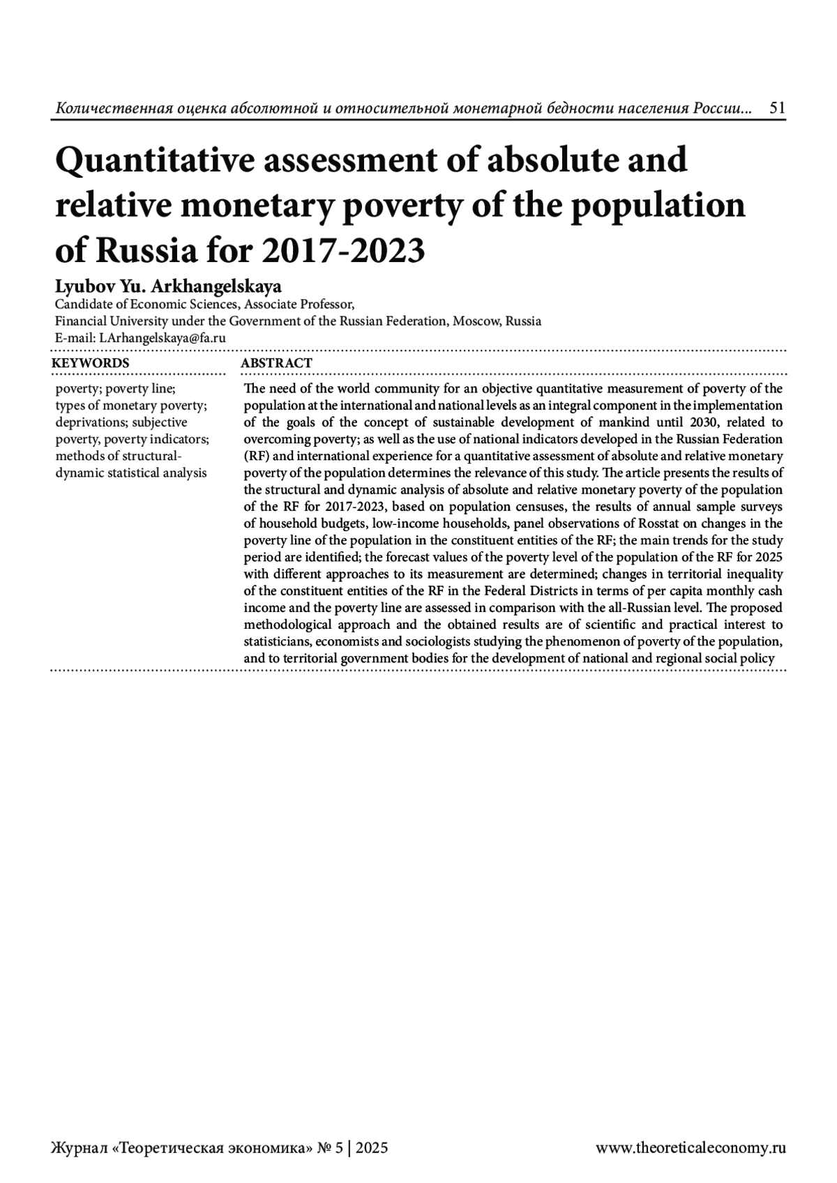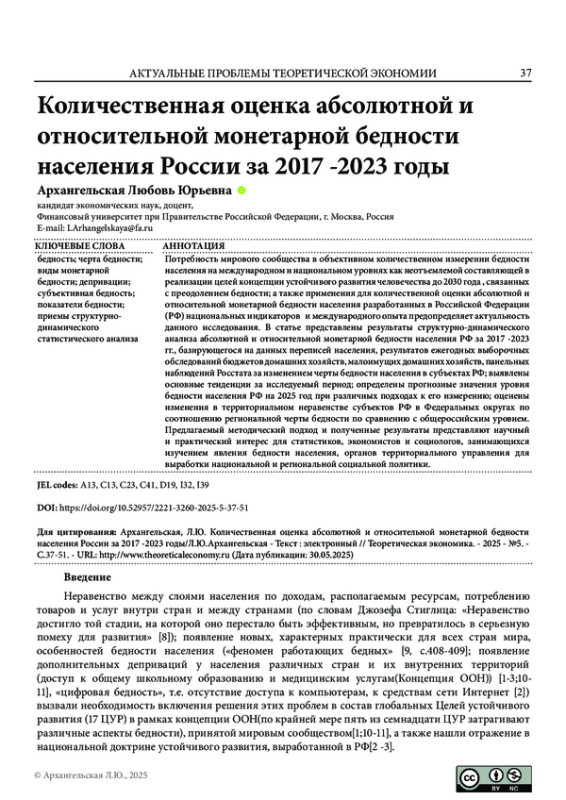 Потребность мирового сообщества в объективном количественном измерении бедности населения на международном и национальном уровнях как неотъемлемой составляющей в реализации целей концепции устойчивого развития человечества до 2030 года, связанных с преодолением бедности; а также применения для количественной оценки абсолютной и относительной монетарной бедности населения разработанных в Российской Федерации (РФ) национальных индикаторов и международного опыта предопределяет актуальность данного исследования. В статье представлены результаты структурно-динамического анализа абсолютной и относительной монетарной бедности населения РФ за 2017 -2023 гг., базирующегося на данных переписей населения, результатов ежегодных выборочных обследований бюджетов домашних хозяйств, малоимущих домашних хозяйств, панельных наблюдений Росстата за изменением черты бедности населения в субъектах РФ; выявлены основные тенденции за исследуемый период; определены прогнозные значения уровня бедности населения РФ на 2025 год при различных подходах к его измерению; оценены изменения в территориальном неравенстве субъектов РФ в Федеральных округах по соотношению региональной черты бедности по сравнению с общероссийским уровнем. Предлагаемый методический подход и полученные результаты представляют научный и практический интерес для статистиков, экономистов и социологов, занимающихся изучением явления бедности населения, органов территориального управления для выработки национальной и региональной социальной политики.
