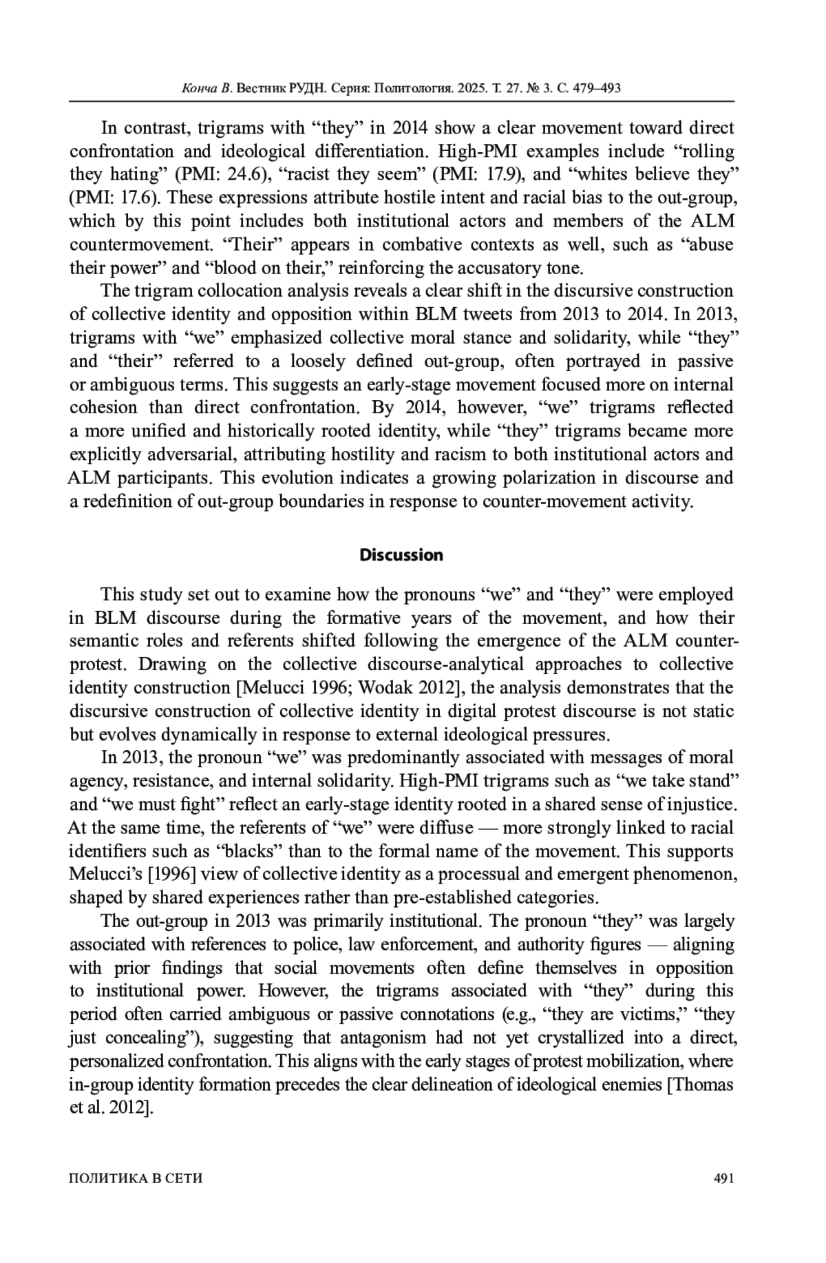 Трансформация коллективной идентичности в цифровом протестном дискурсе может фиксироваться с помощью отслеживания употребления местоимений первых и третьих лиц во множественном числе. Основываясь на теории коллективной идентичности и дискурсивном подходе, автор анализирует выборку из 100 000 твитов, опубликованных в период с июля 2013 г. по декабрь 2014 г., чтобы проследить использование местоимений «мы» и «они» до и после появления контрпротестного движения All Lives Matter. С применением триграммного коллокационного анализа и расчёта PMI (информационной взаимной значимости) выявляется переход от разрозненной и морально окрашенной внутригрупповой коллективной идентичности в 2013 г. к более устойчивой и политически оформленной идентичности в 2014 г. Одновременно изменяется и образ «других»: если в 2013 г. он был представлен преимущественно государственными институтами (например, полицией), то в 2014 г. он дополняется идеологическими оппонентами из гражданского общества. Полученные результаты подтверждают гипотезу о том, что появление контрпротестов изменило дискурсивные границы оппозиции, усилив поляризацию и дуализм в структуре коллективной идентичности. Работа вносит вклад в изучение взаимодействия протестов и контрпротестов, выявляя лингвистические механизмы формирования, оспаривания и перестройки групповой идентичности в условиях идеологического противостояния.