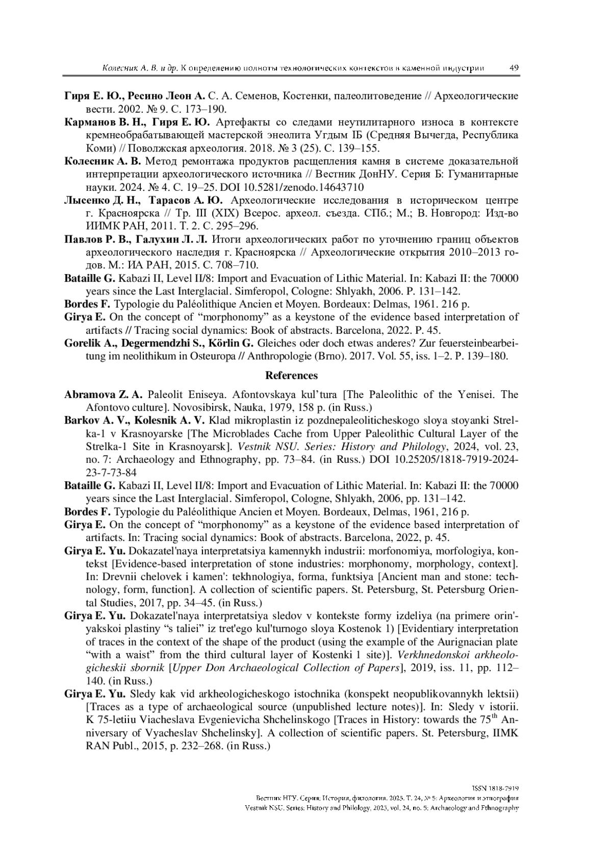 9. Колесник А. В. Метод ремонтажа продуктов расщепления камня в системе доказательной интерпретации археологического источника // Вестник ДонНУ. Серия Б: Гуманитарные науки. 2024. № 4. С. 19-25. https://doi.org/10.5281/zenodo.14643710
