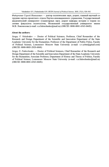 8. Сморгунов Л.В. Институционализация управляемости и проблема контроля в пространстве цифровых коммуникаций // Южно-российский журнал социальных наук. 2019. Т. 20, № 3. С. 62-75. DOI: 10.31429/26190567-20-3-62-75 EDN: LLGQAM