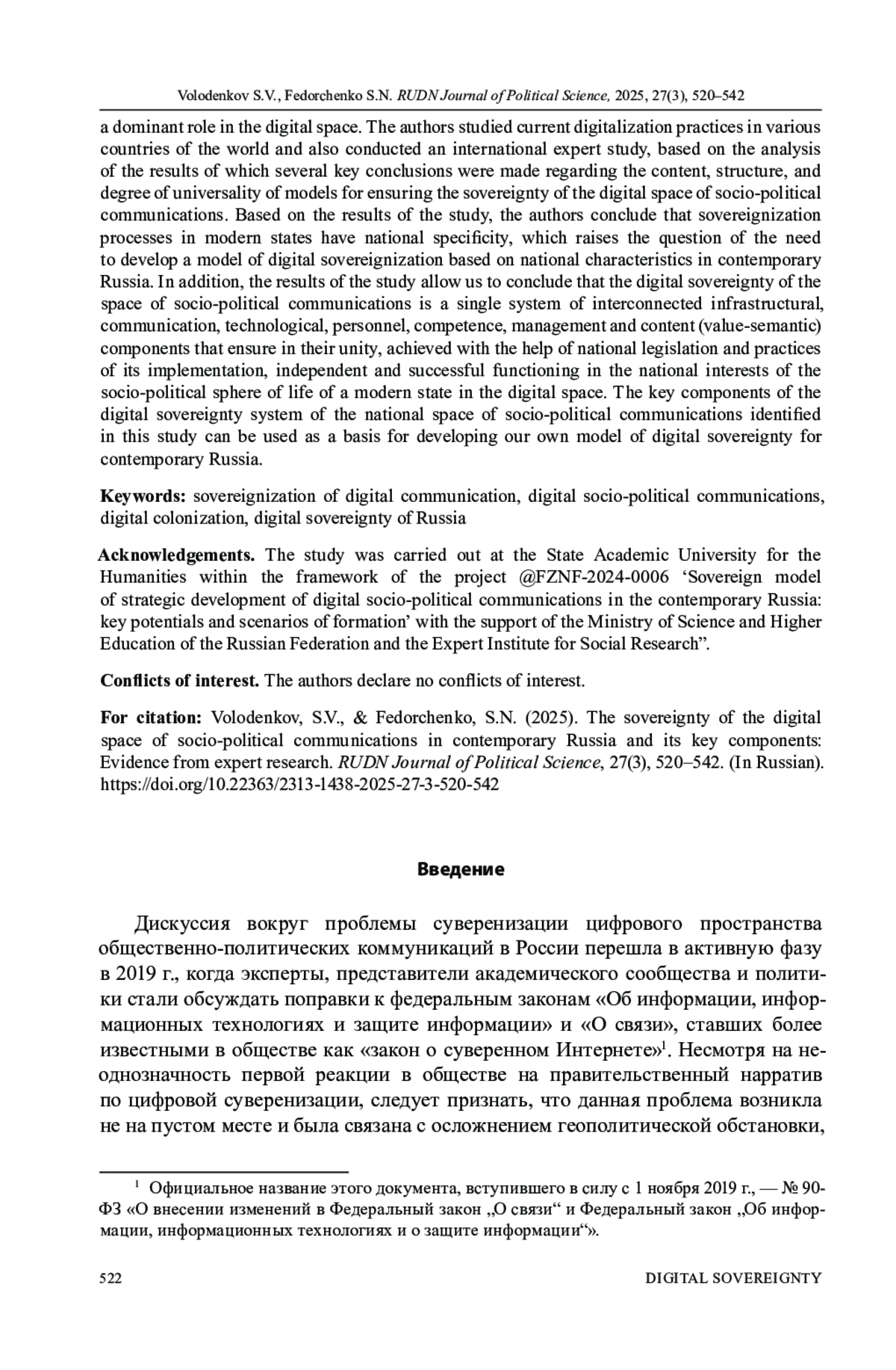 Дискуссия вокруг проблемы суверенизации цифрового пространства общественно- политических коммуникаций в России перешла в активную фазу в 2019 г., когда эксперты, представители академического сообщества и политики стали обсуждать поправки к федеральным законам «Об информации, информационных технологиях и защите информации» и «О связи», ставших более известными в обществе как «закон о суверенном Интернете».