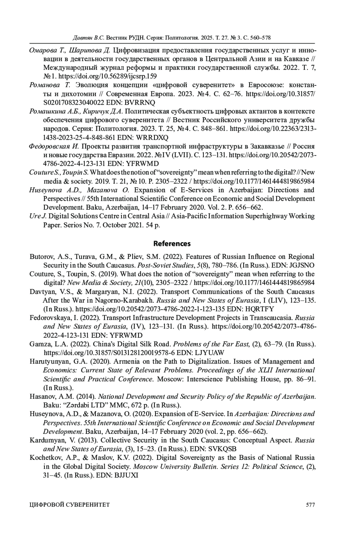 6. Давтян В.С., Маргарян Н.И. Транспортные коммуникации Южного Кавказа после войны в Нагорном Карабахе // Россия и новые государства Евразии. 2022. № I (LIV). С. 123-135. DOI: 10.20542/2073-4786-2022-1-123-135 EDN: HQRTFY