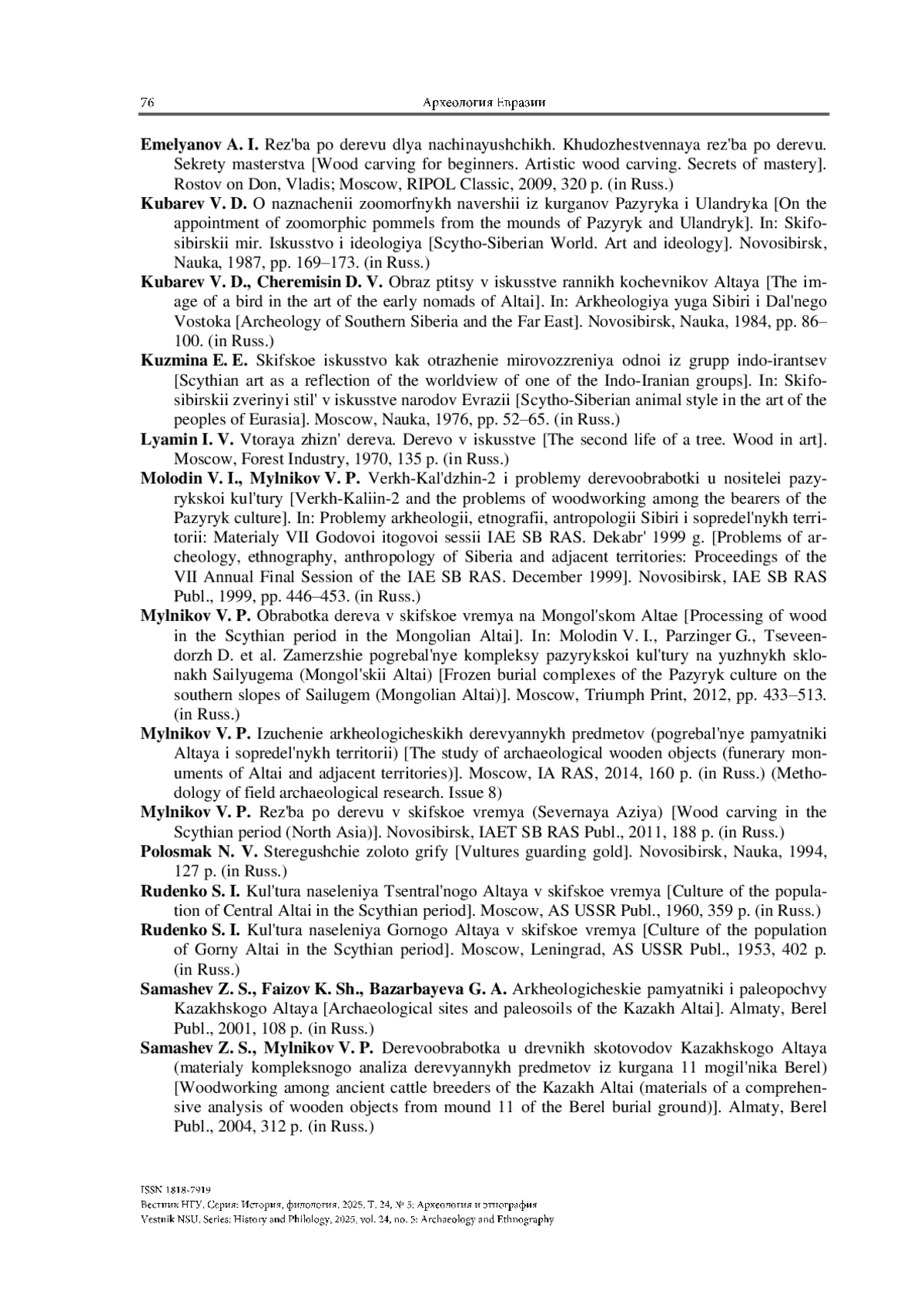 9. Мыльников В. П. Обработка дерева в скифское время на Монгольском Алтае // Молодин В. И., Парцингер Г., Цэвээндорж Д. и др. Замерзшие погребальные комплексы пазырыкской культуры на южных склонах Сайлюгема (Монгольский Алтай). М.: Триумф принт, 2012. С. 433-513.